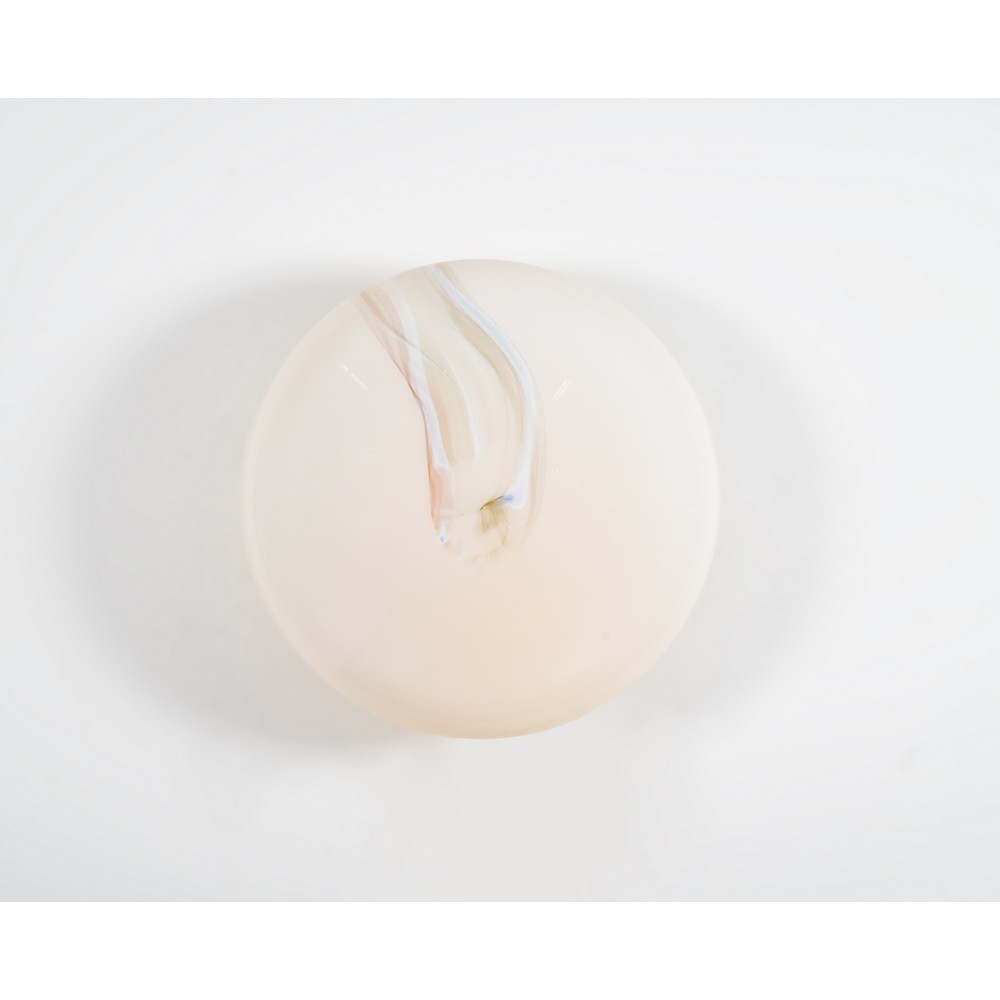 Lampada da soffitto/parete a due luci, struttura in metallo con diffusore sferico in vetro lattimo decorato con murina policroma a nastro.