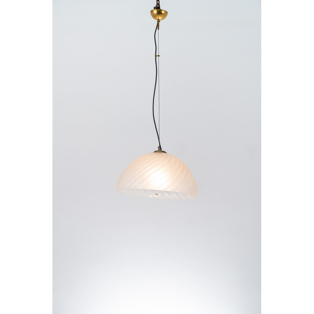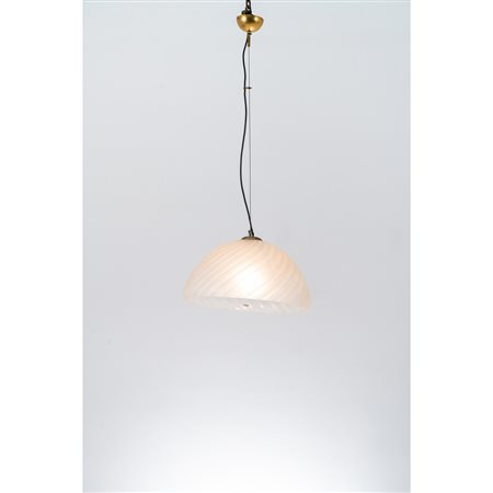 Lampada a sospensione ad una luce, diffusore semisferico in vetro rosato e decorato con motivo a spirale, metallo dorato. Etichetta di produzione.