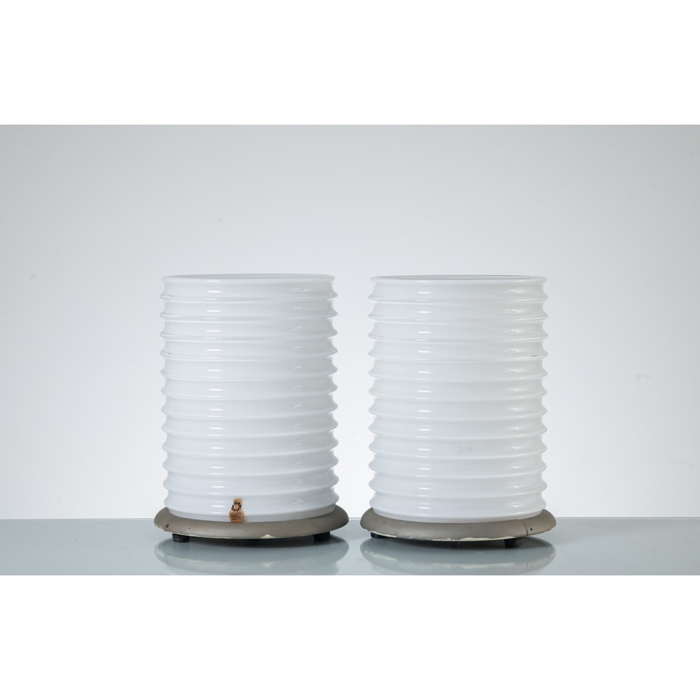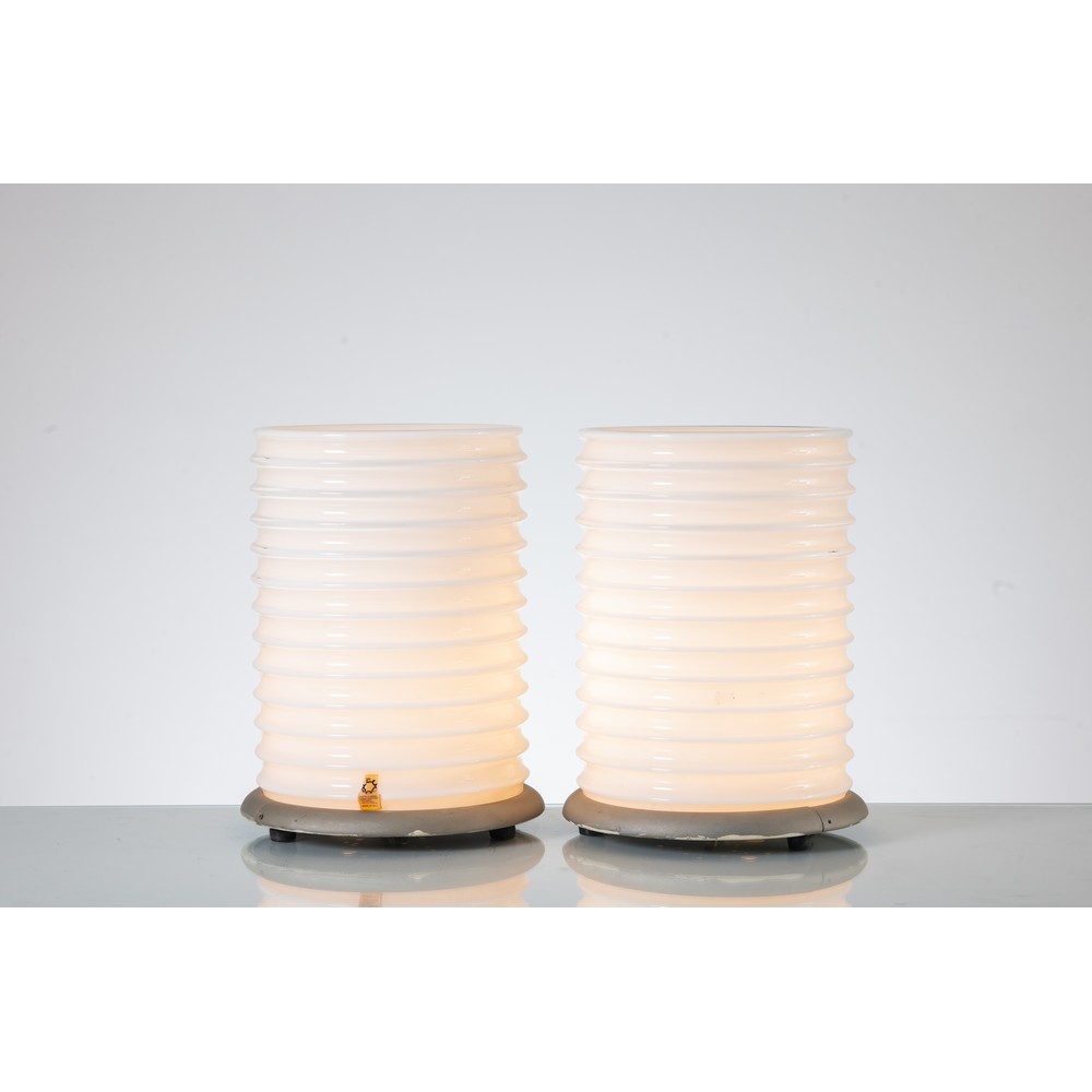 Coppia di lampade da tavolo ad una luce, metallo verniciato, diffusore in vetro opalino cilindrico ad anelli sovrapposti. Etichetta di produzione.