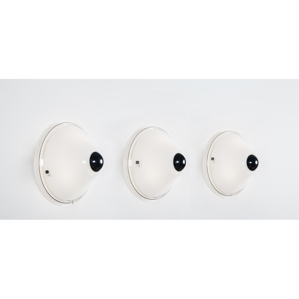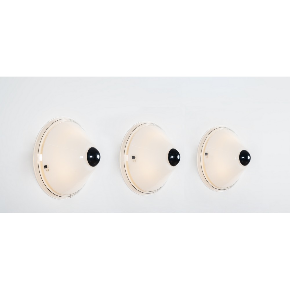 Tre lampade da soffitto/parete a tre luci con struttura in metallo verniciato bianco, diffusore conico in vetro lattimo decorato sul bordo in vetro incolore con rigatura nera. Fermo in metallo verniciato nero. Etichetta di produzione.