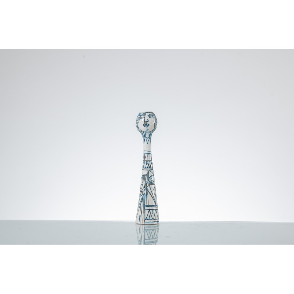 Vaso in ceramica a figura umana smaltata bianca e decorata con incisioni blu e nere. Firma alla base.