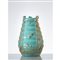 Vaso in ceramica smaltata verde e oro, corpo a goccia decorato con rete e pesci a rilievo, bocca piana circolare con tre anse ricurve.