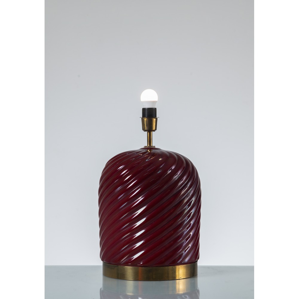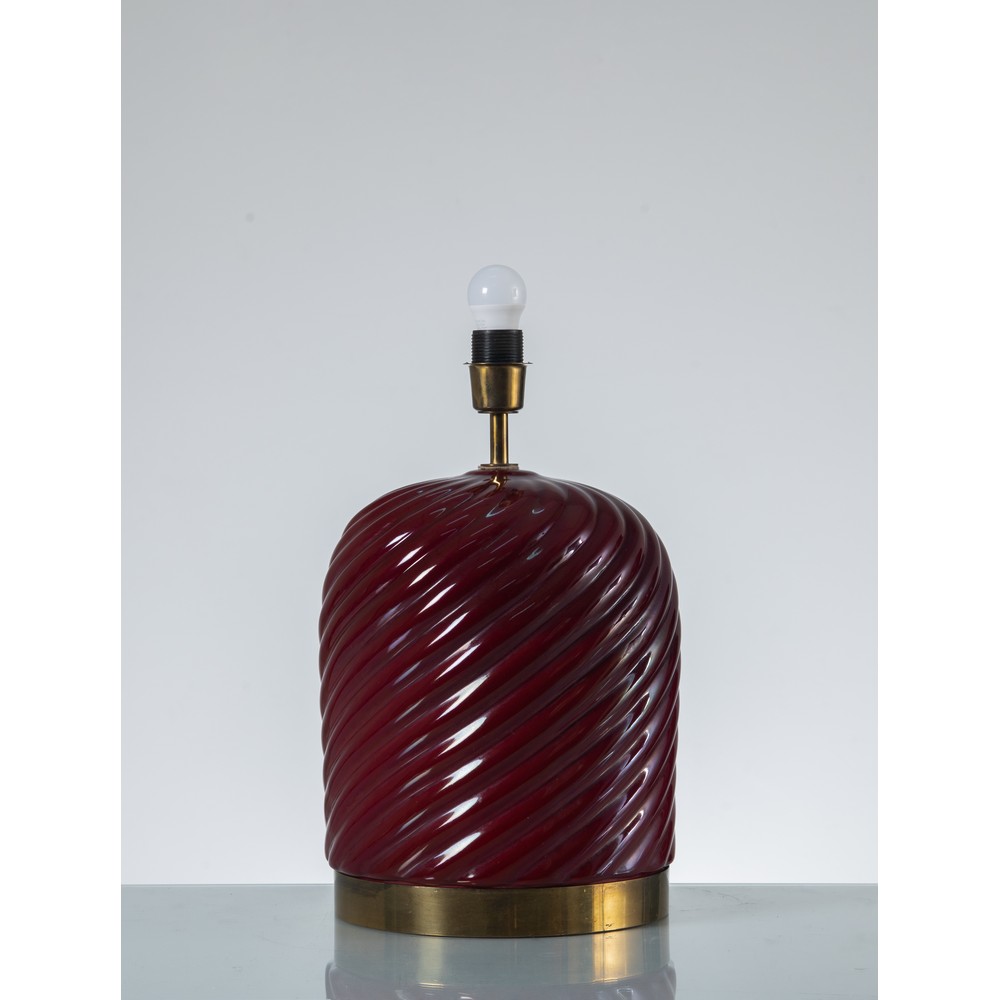 Lampada da tavolo ad una luce con corpo cilindrico in ceramica invetriata a torchon bordeaux, base in ottone. Marchio di produzione.
