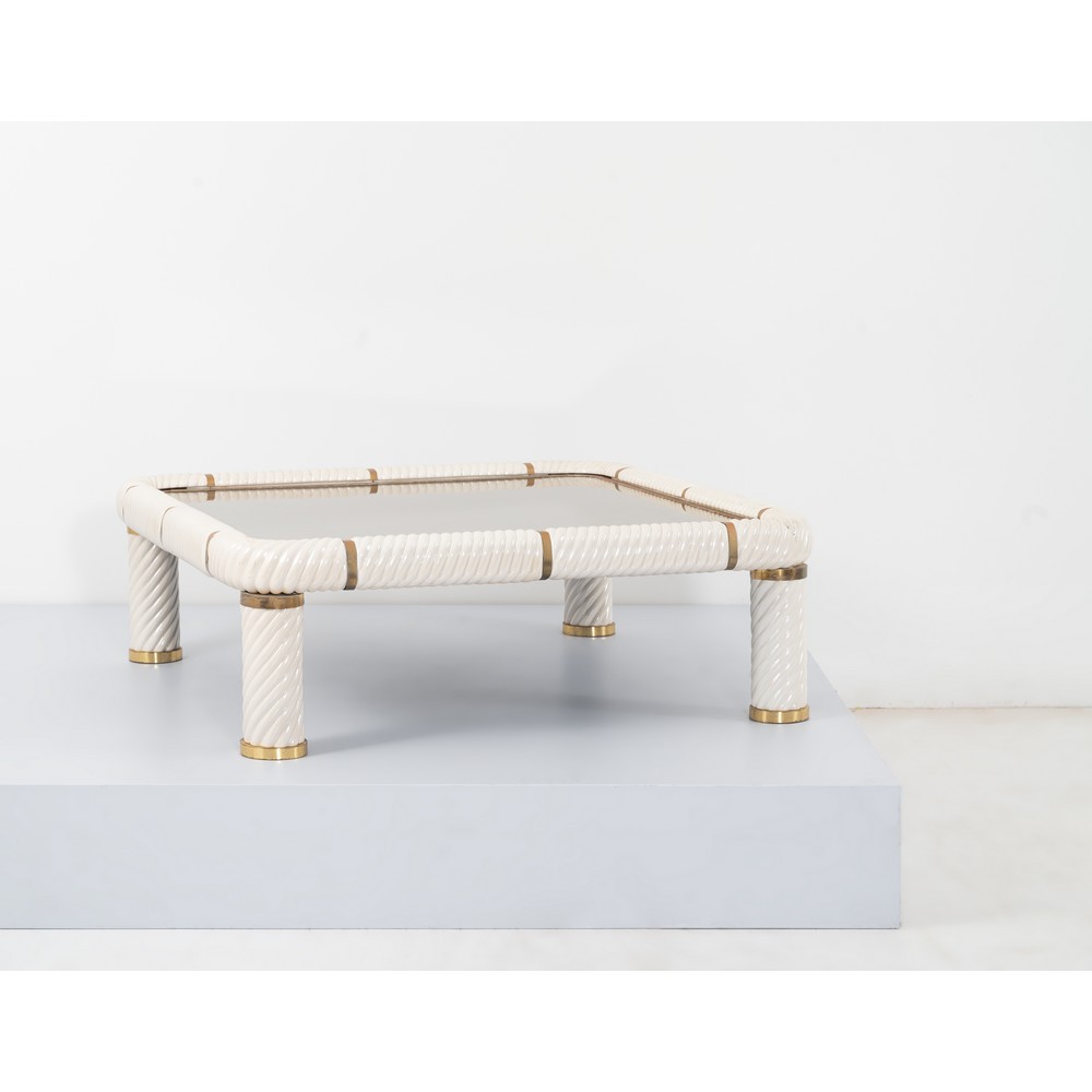 Tavolo da salotto con struttura in ceramica smaltata, ottone, cristallo specchiato e colorato.