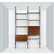 Libreria cielo terra modello “Giraffa” a due campate in legno esotico, montanti in legno verniciato con parti finali in legno verniciato nero, terminali regolabili in plastica nera, sul fronte da un lato tre mensole ed un vano con due ordini di cassetti, dall’altro tre mensole ed un vano chiuso con due ante battenti, minuterie in ottone.