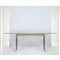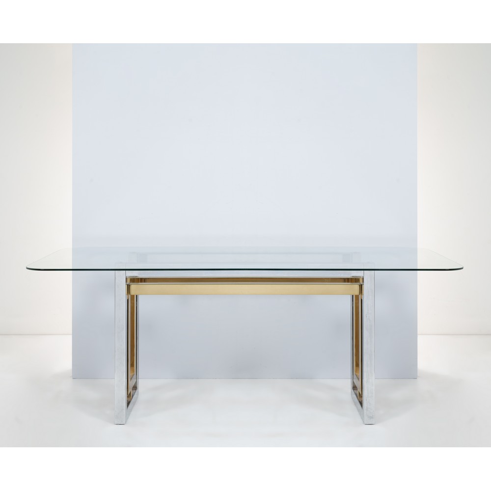 Tavolo da pranzo con struttura in metallo cromato e dorato, piano rettangolare in cristallo trasparente.