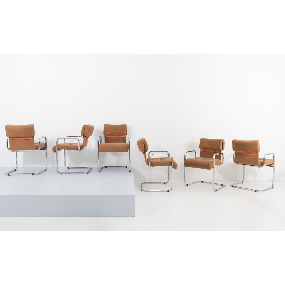 Sei poltroncine con struttura in metallo tubolare cromato. Spalliera e seduta con imbottitura e rivestimento in tessuto senape con dettagli in cuoio.