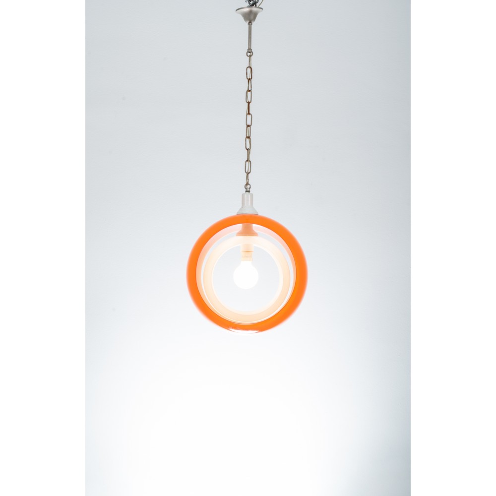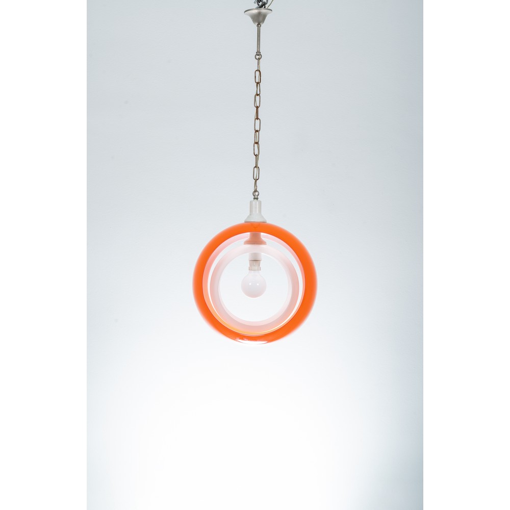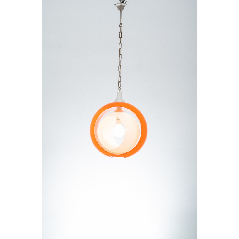 Lampada a sospensione ad una luce modello “Eclisse”, diffusore globulare rotante doppio in vetro incamiciato uno arancione ed uno lattimo, metallo laccato e metallo cromato.