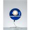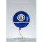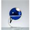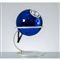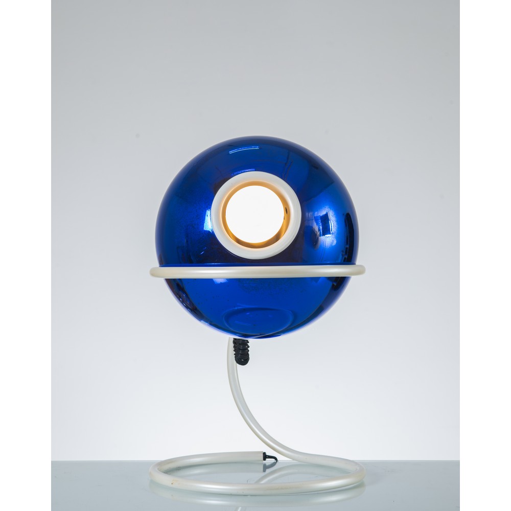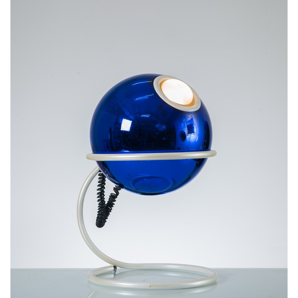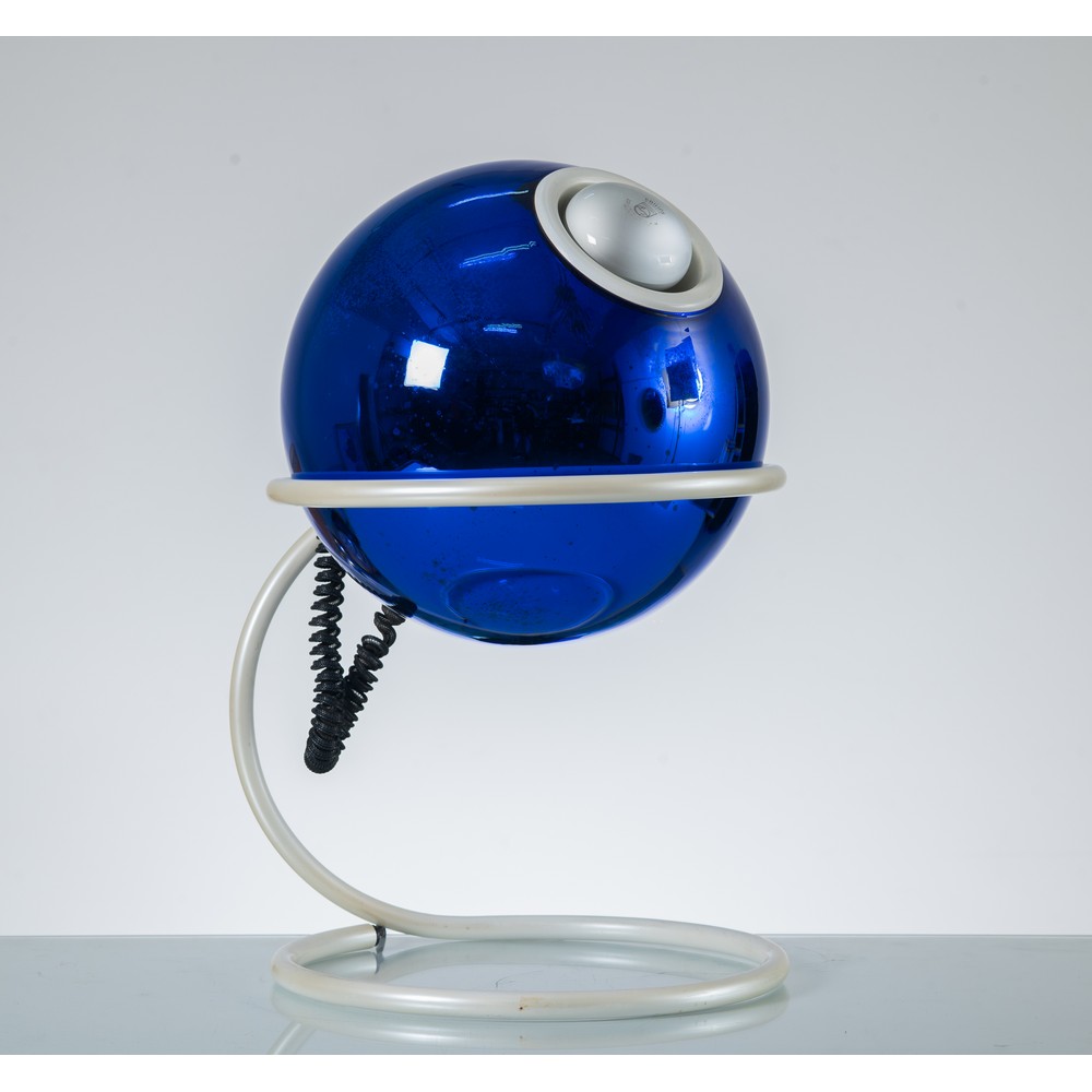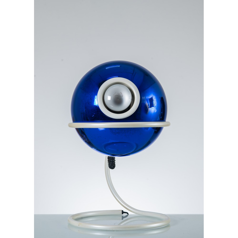 Lampada da tavolo ad una luce, struttura in metallo verniciato bianco, diffusore sferico globulare in cristallo specchiato blu.