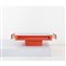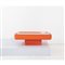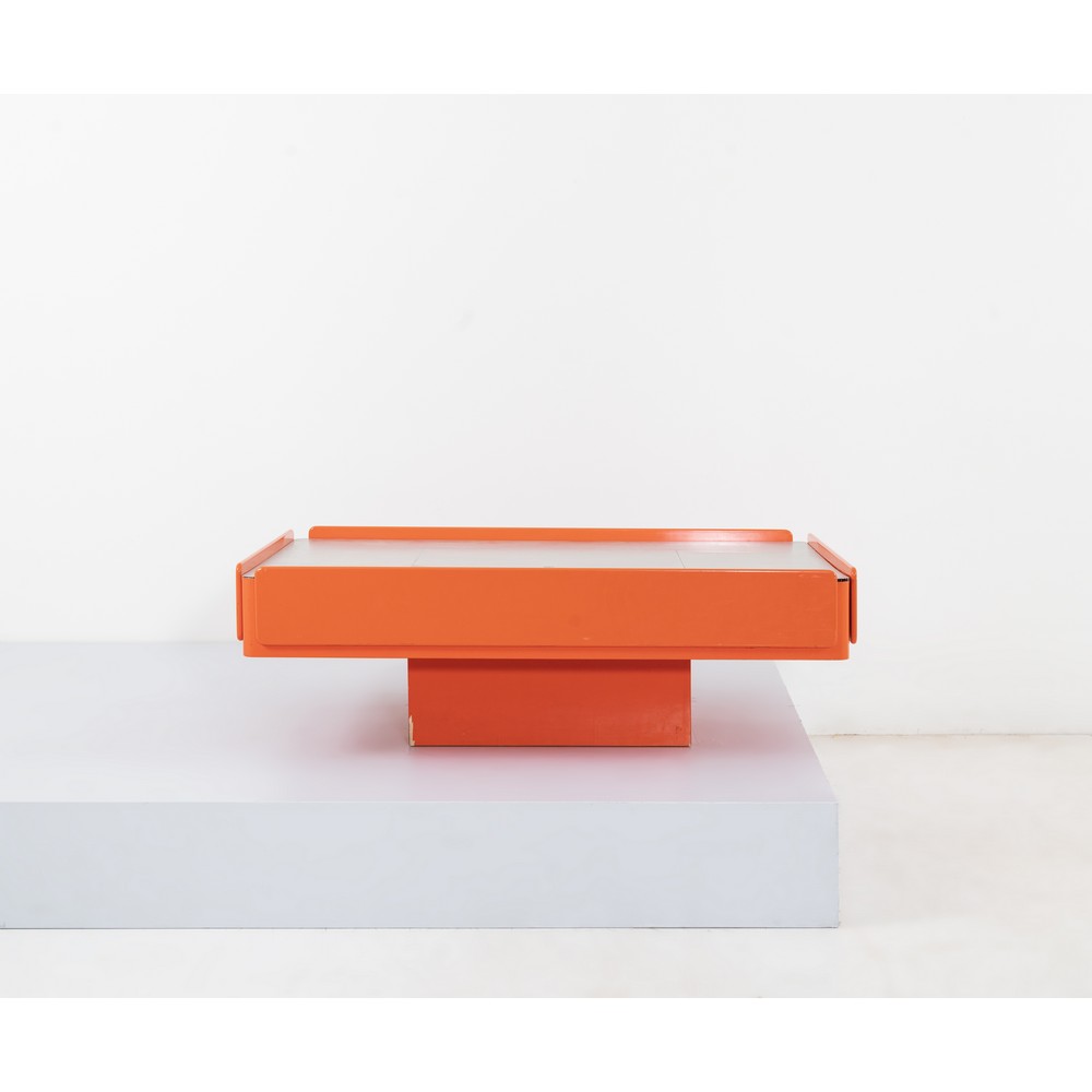 Tavolo basso contenitore modello ”Caori”, struttura in legno laccato arancione e rivestimenti in metallo cromato, vani contenitori. Alla base caduta di colore.