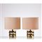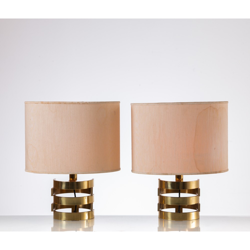 Coppia di lampade da tavolo ad una luce, struttura cilindrica in ottone composta da lame sovrapposte, diffusore circolare in tessuto avorio.
