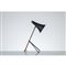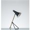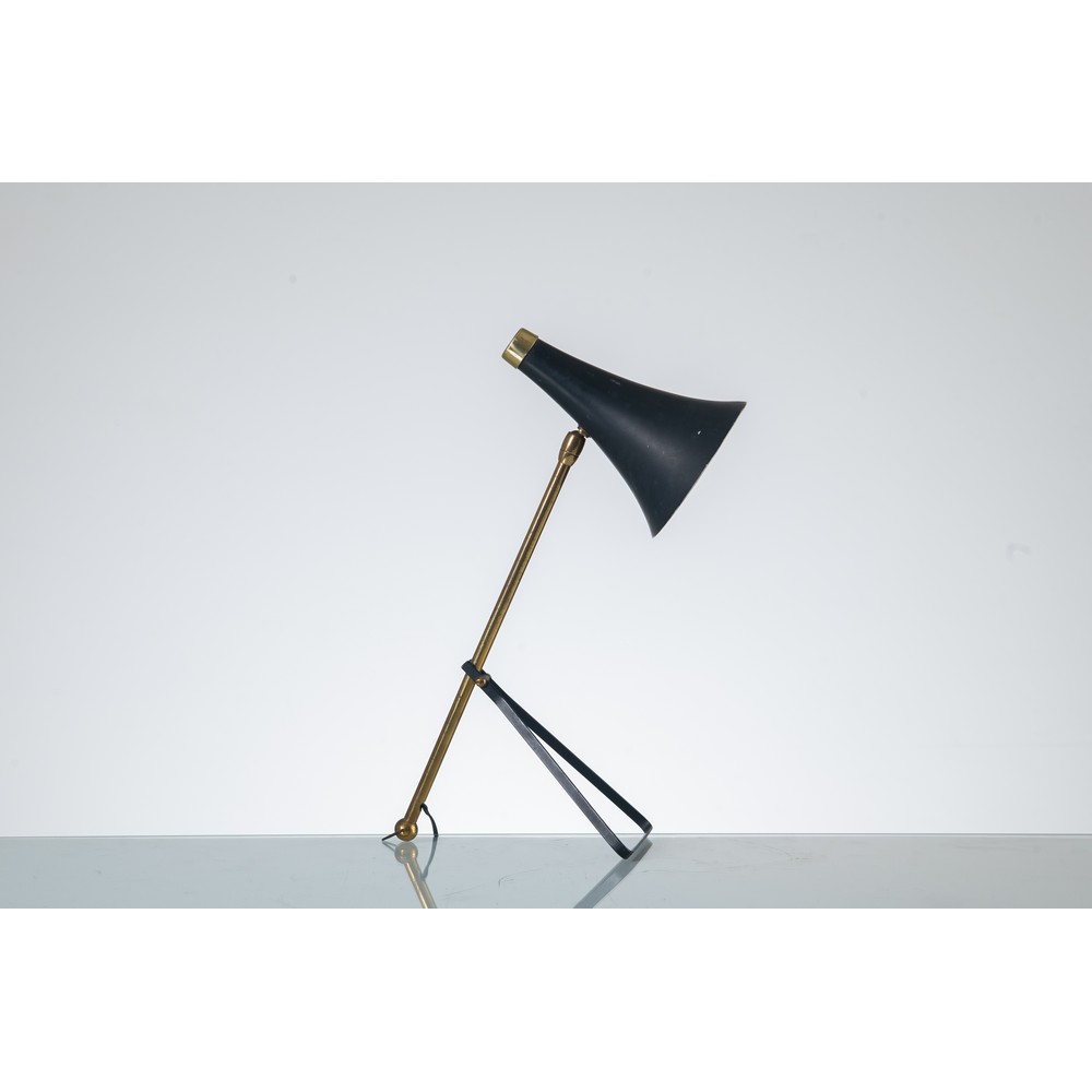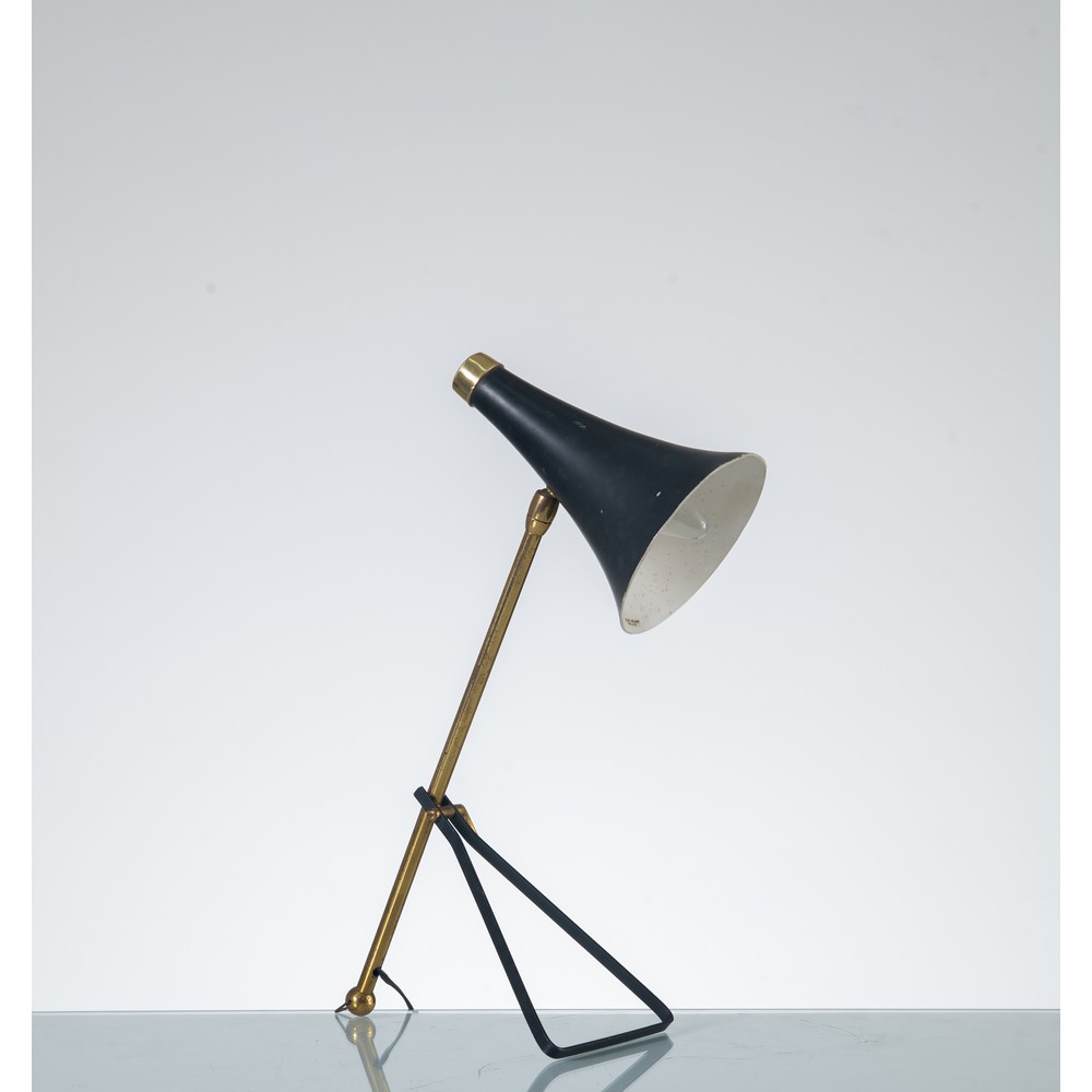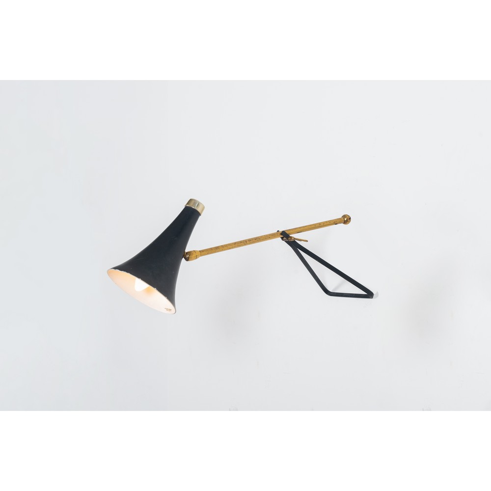Lampada da tavolo e parete ad una luce, struttura in metallo verniciato nero, minuterie in ottone, diffusore conico in metallo verniciato nero e bianco. Etichetta di produzione.