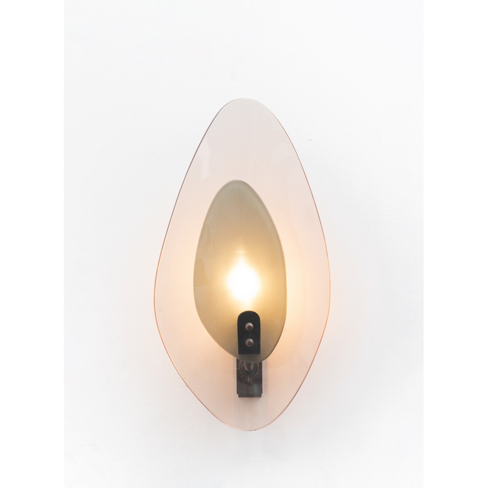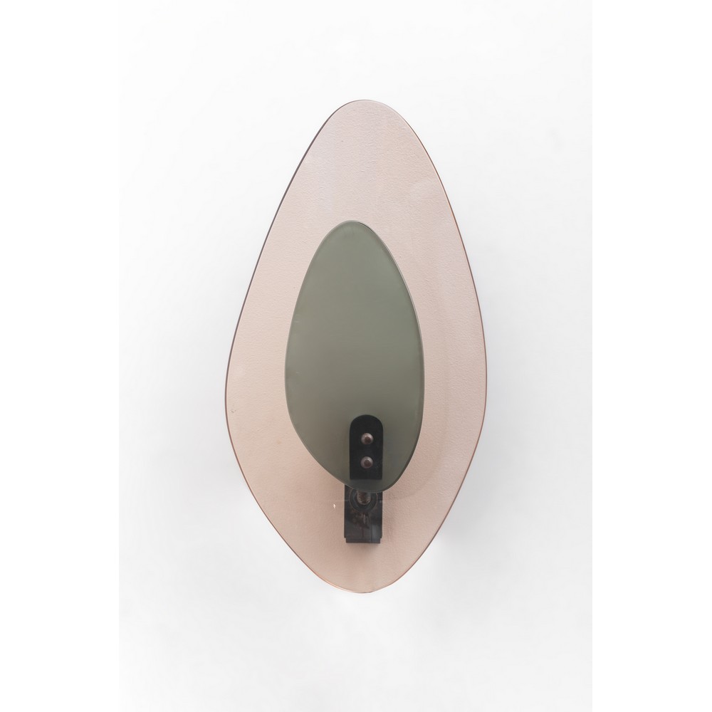 Lampada da parete ad una luce con diffusore curvato, sagomato e colorato rosa, ottone e cristallo sagomato fumè.