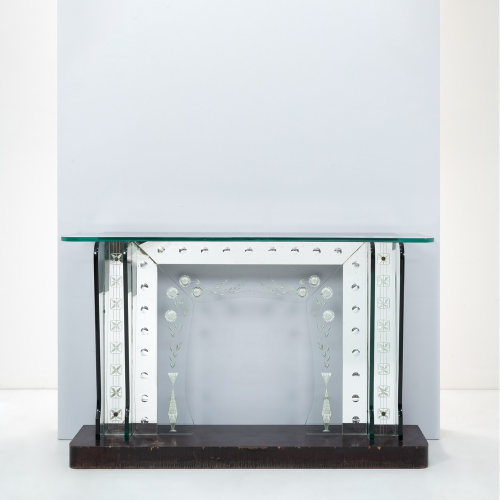 Camino in cristallo incolore e cristallo specchiato, decorato con motivi floreali incisi e specchiati. Segni di uso.