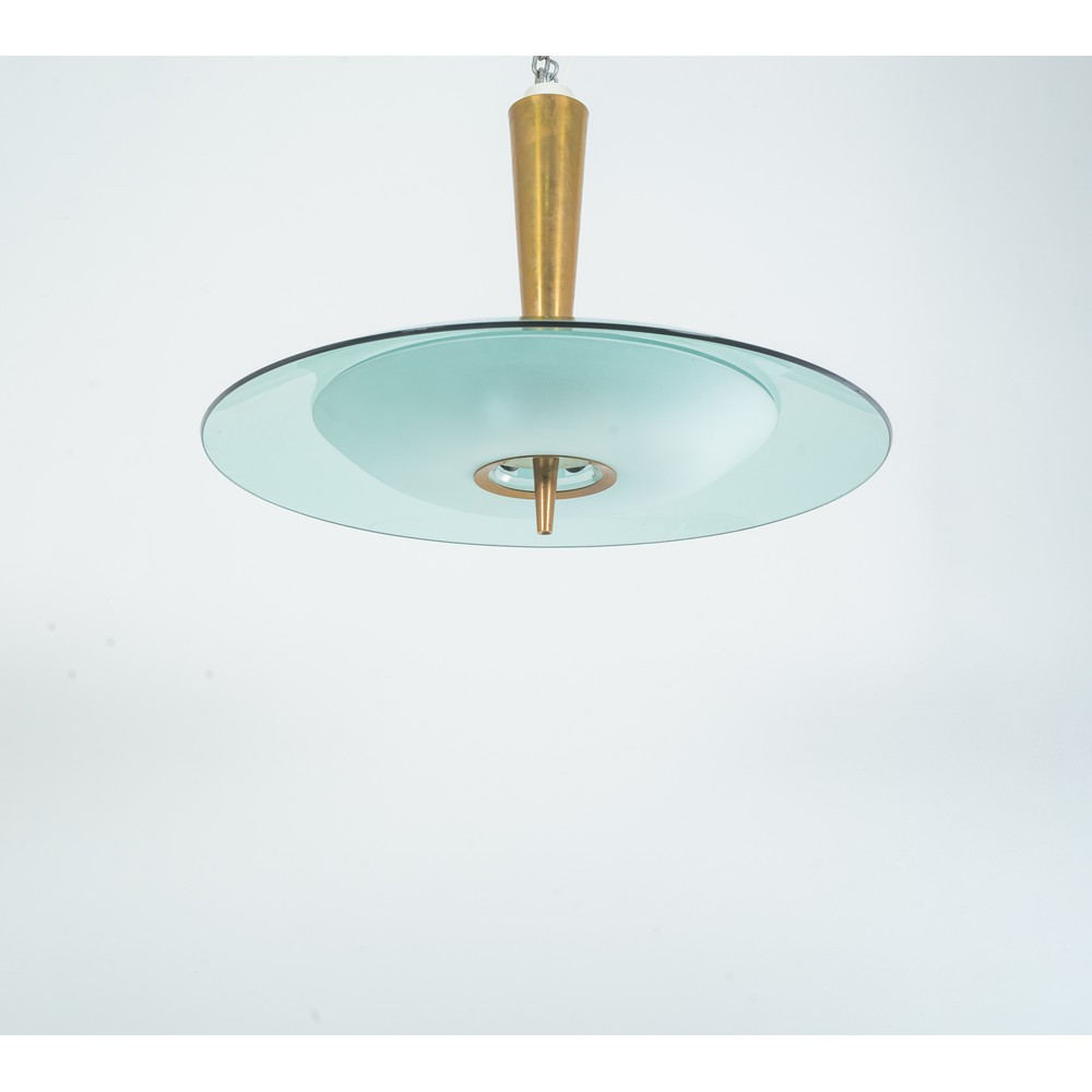 Lampada a sospensione a otto luci modello “1462”, struttura in ottone con diffusore circolare in cristallo colorato curvato e molato e un diffusore in cristallo molato e satinato.