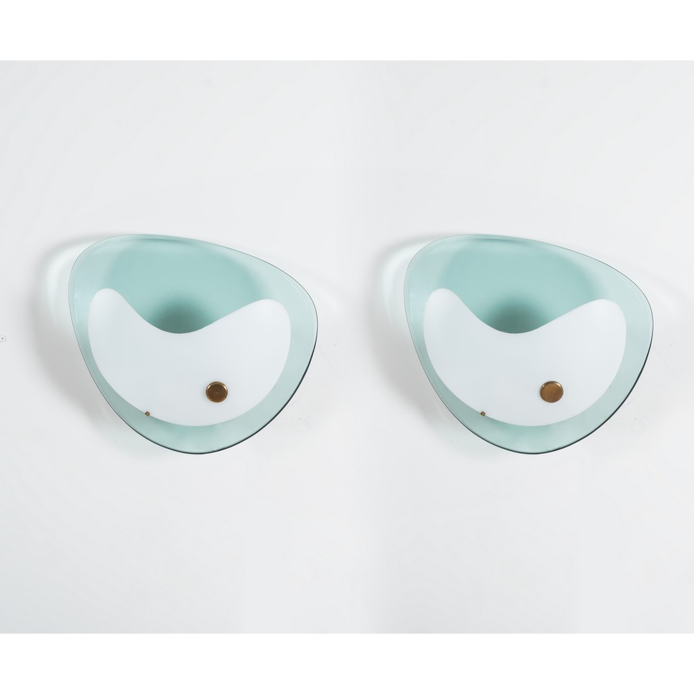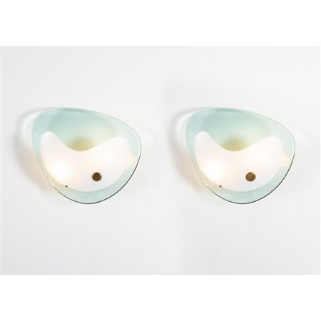 Coppia di lampade da parete a due luci modello “1793”, struttura in ottone e metallo verniciato bianco, diffusore a mezza luna in plexiglass lattimo e in cristallo molato colorato azzurro. Marchio incusso su un elemento in ottone.