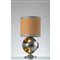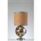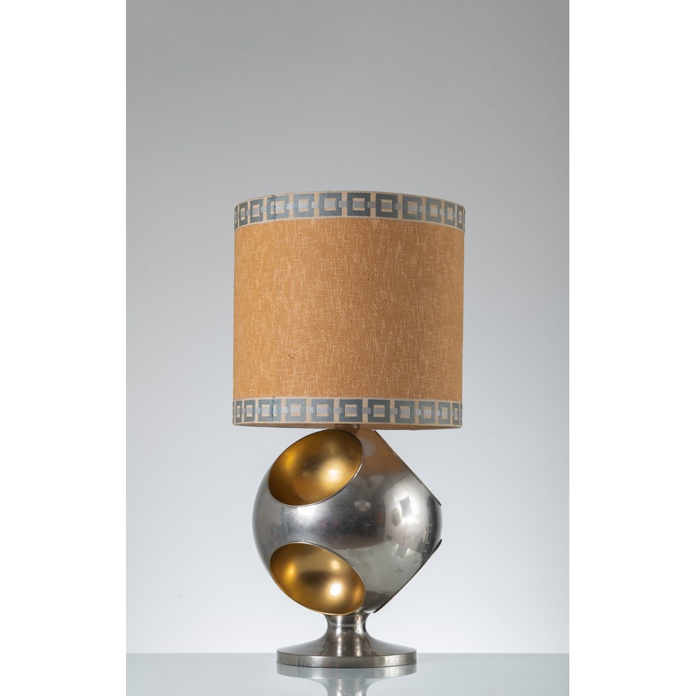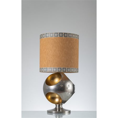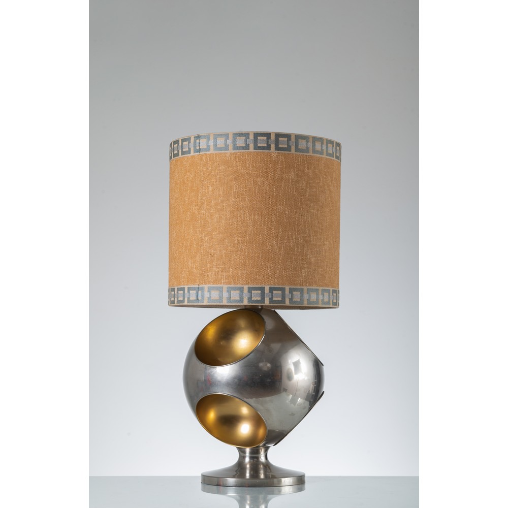 Lampada da tavolo ad una luce, corpo globulare in acciaio cromato con concavità in metallo dorato, base circolare.