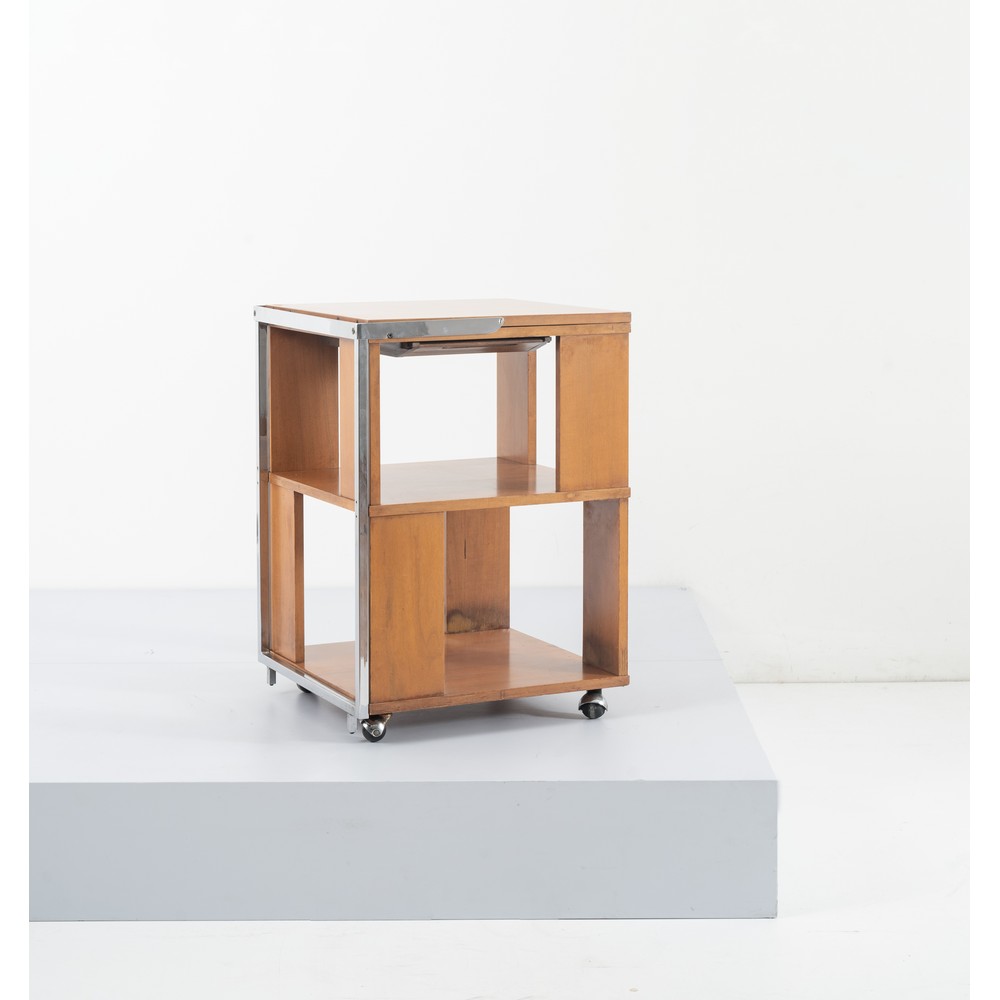 Mobile libreria girevole e scrivania, struttura in legno, piano scrivania a ribalta con accessori in metallo cromato.