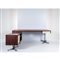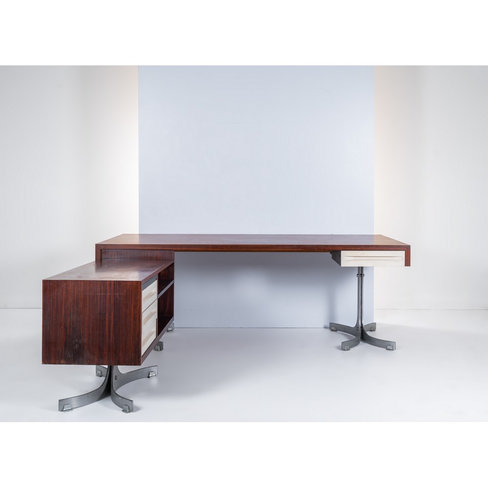 Scrivania dirigenziale a “L” con struttura in legno esotico, quattro cassetti in metallo laccato, un vano a giorno con mensola, sostegni in acciaio. Marchio originale.