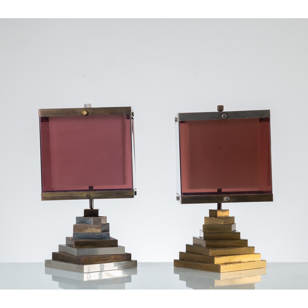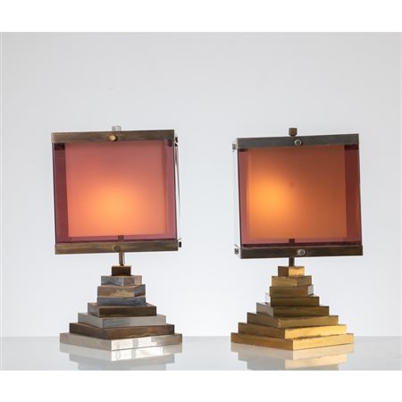 Due lampade da tavolo ad una luce, corpo a piani sovrapposti uno in metallo dorato ed uno in metallo cromato e dorato, diffusore con struttura in metallo dorato e plexiglass colorato.