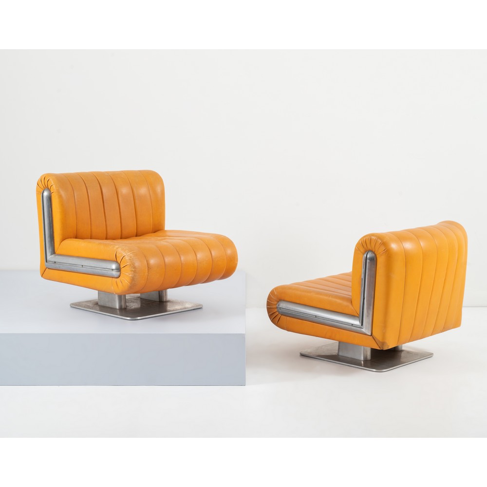 Coppia di poltrone della serie "Sit Sistem", struttura in alluminio pressofuso, metallo cromato, imbottitura a righe e rivestimento originale in pelle cognac. Marchio di produzione sotto la base. Segni di uso e difetti.