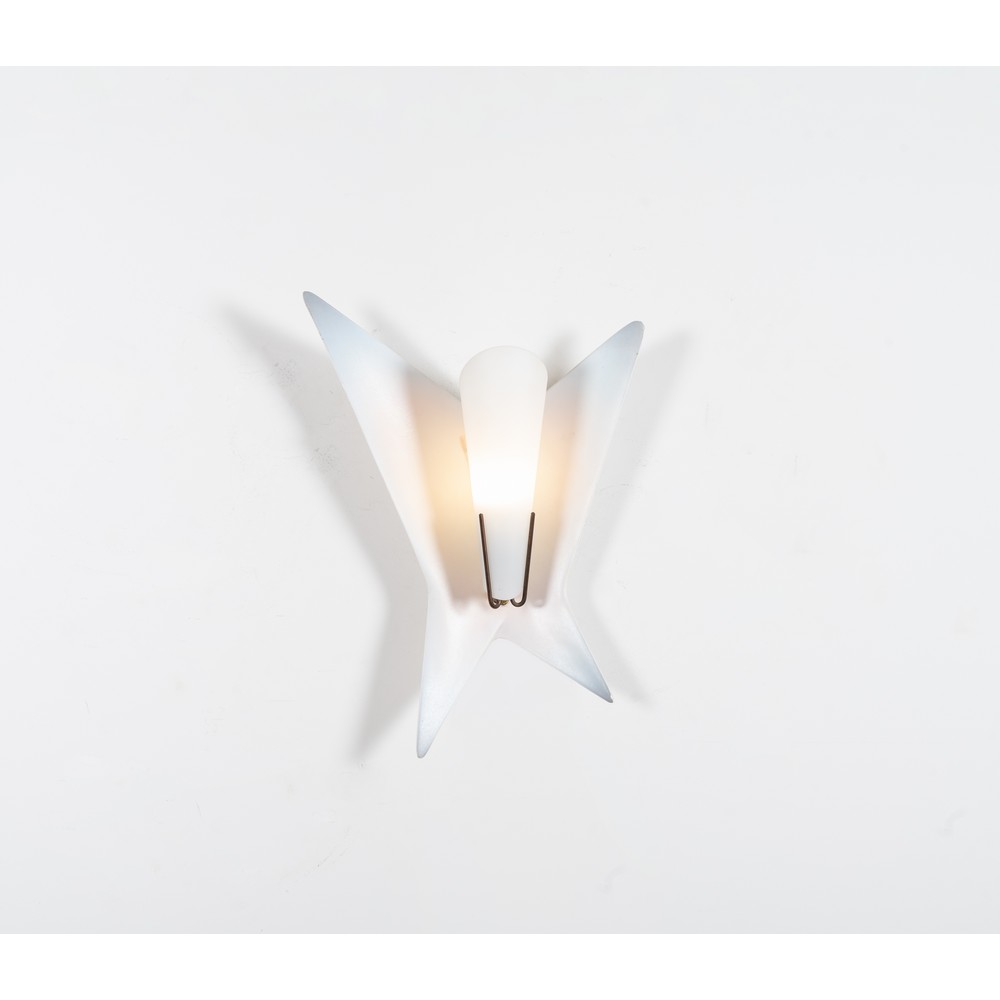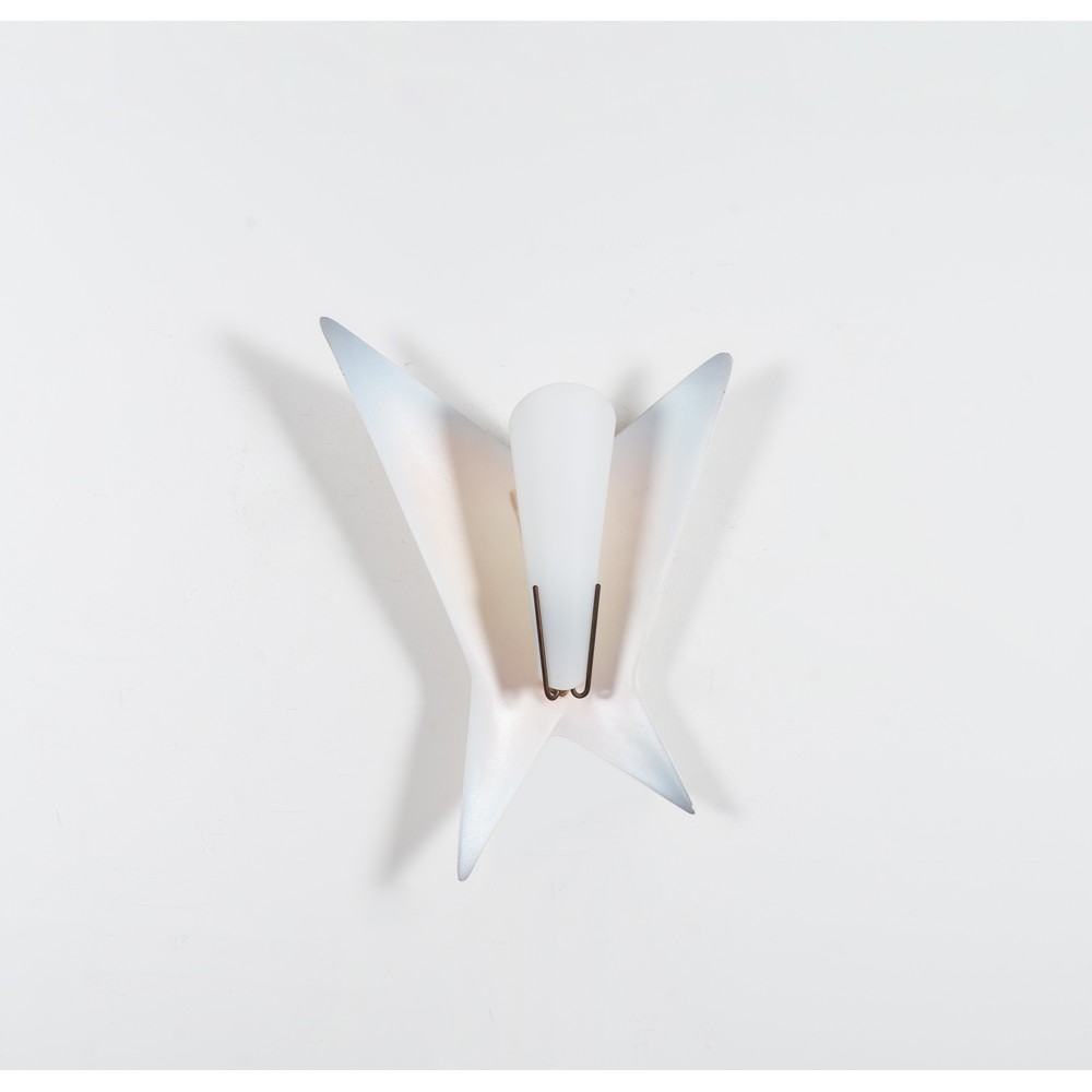 Lampada da parete ad una luce in ceramica bianca e celeste a sfumare, corpo geometrico a quattro punte con diffusore conico in vetro opalino satinato, ottone. Marchio di produzione.
