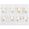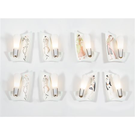 Otto lampade da parete ad una luce in ceramica bianca e celeste a sfumare decorate in policromia con personaggi della commedia dell’arte, corpo geometrico a L con diffusore conico in vetro opalino satinato, ottone. Marchio di produzione.