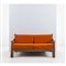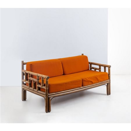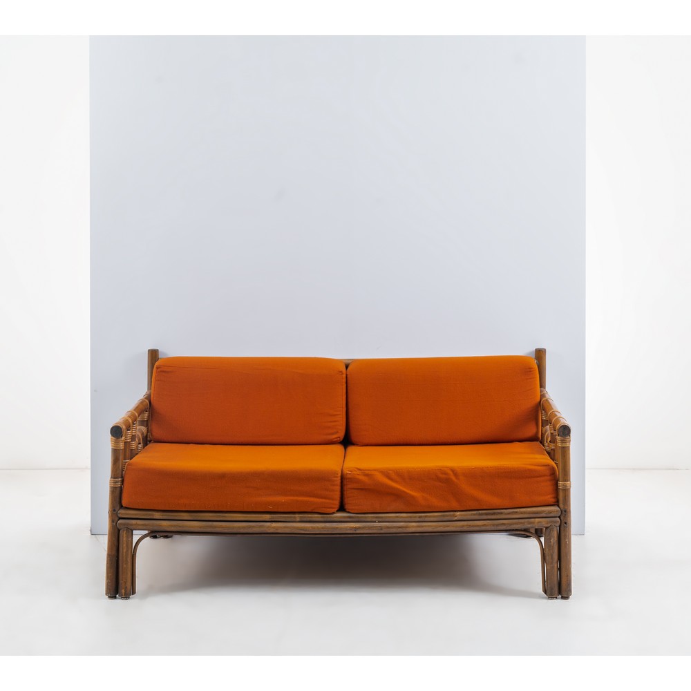 Divano a due posti con struttura in canna di bamboo, cuscini di spalliera e seduta con imbottitura e rivestimento in tessuto color mattone. Difetti ed usure alle cinghie.
