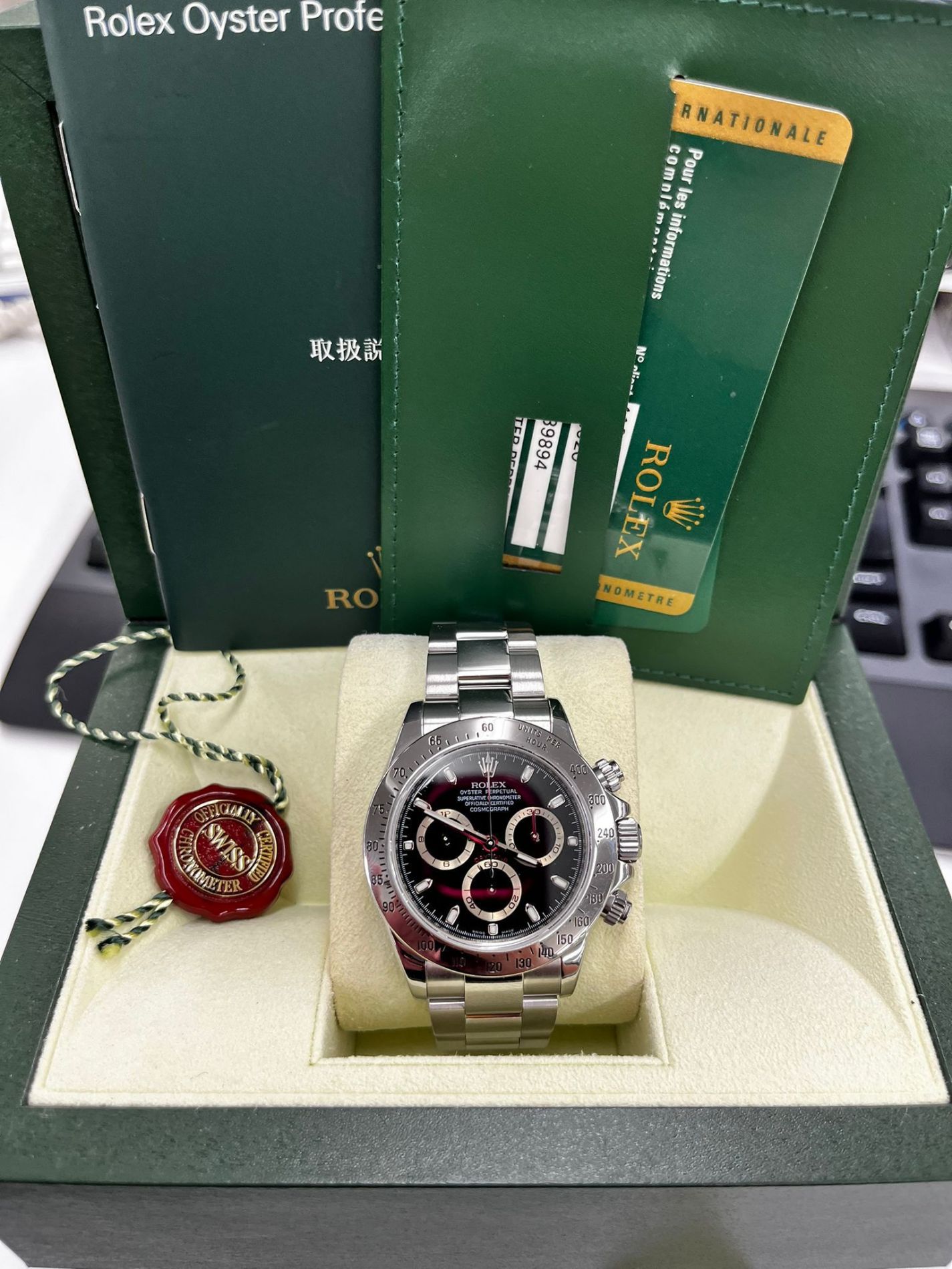 Marca Rolex Modello (Orologio) Daytona Numero di referenza 116520 chromalight Carica Automatico Materiale della cassa Acciaio Materiale cinturino Acciaio Anno di produzione 2007/08 Condizione Usato (Ottimo) documenti originali, no box Materiale della cassa Acciaio Diametro 40 mm Impermeabile 10 ATM Materiale lunetta Acciaio Vetro Vetro zaffiro Quadrante nero Numeri sul quadrante Senza numeri Cinturino Materiale cinturino Acciaio Colore cinturino Acciaio Chiusura Déployante Materiale chiusura Acciaio - COMMISSIONE D’ASTA 25%