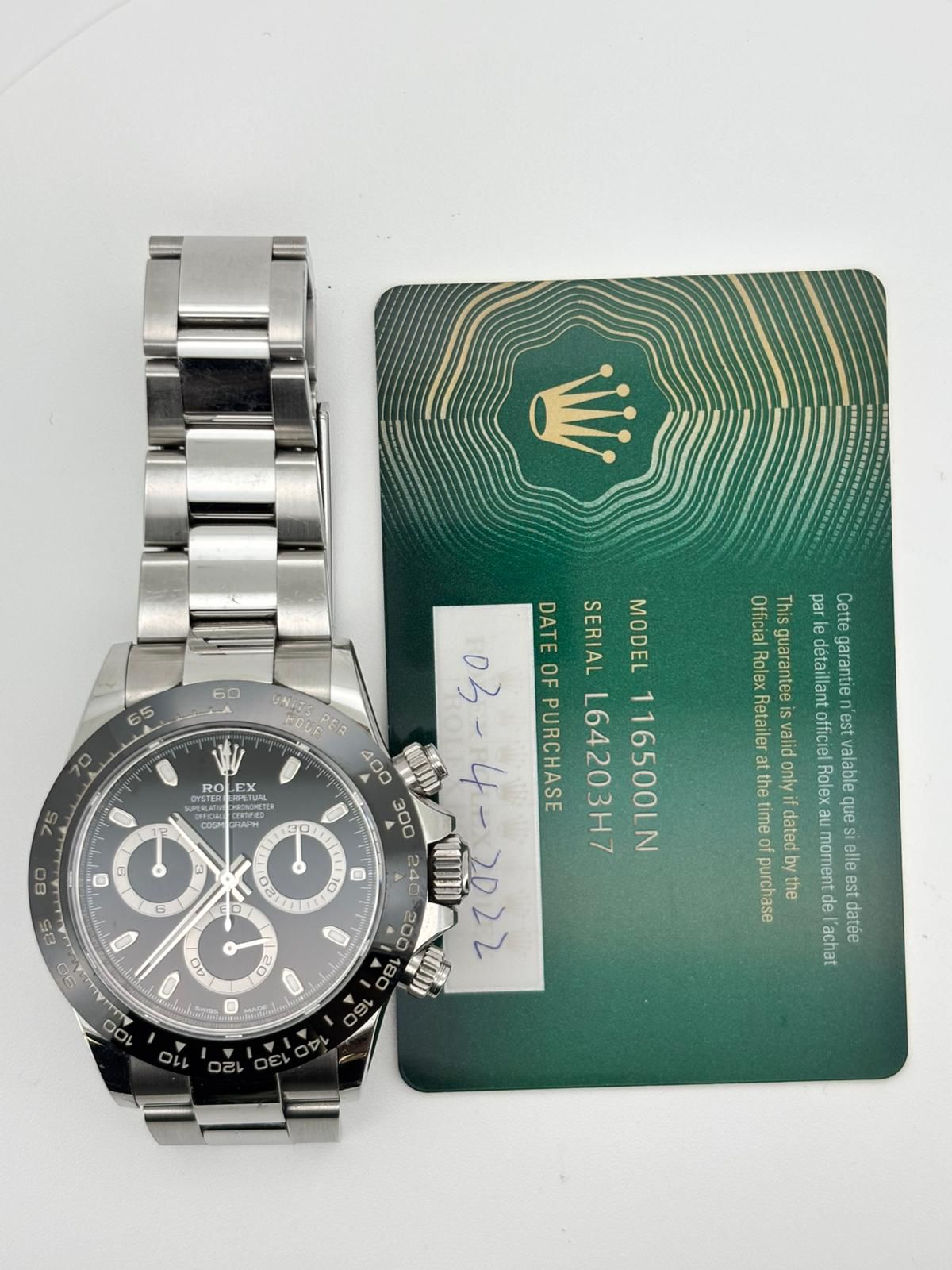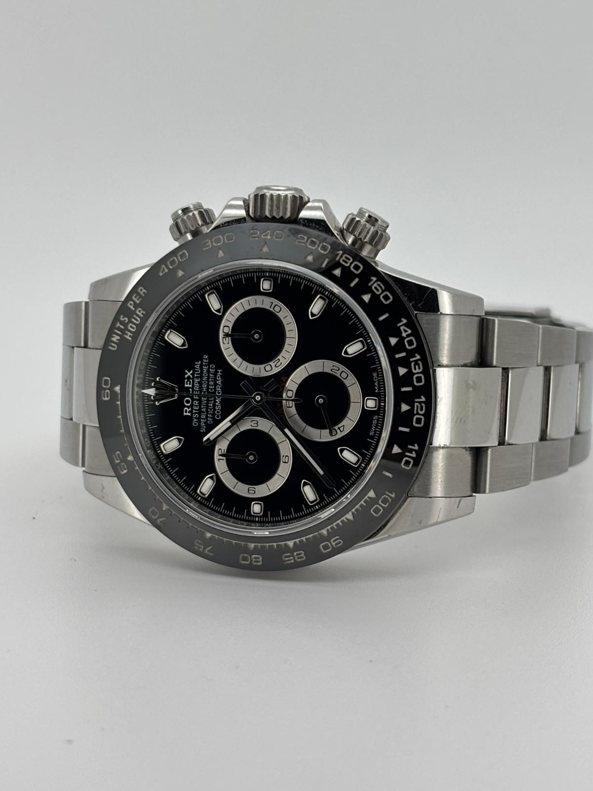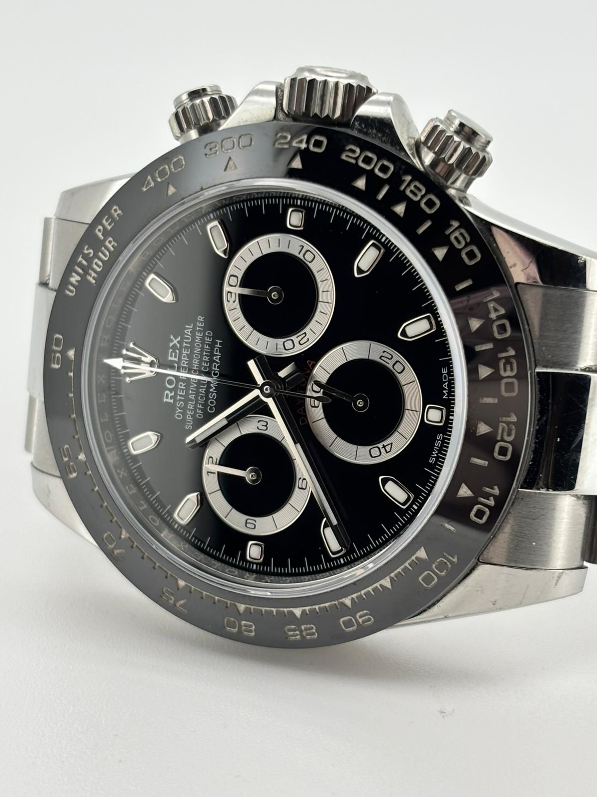 Marca Rolex Modello (Orologio) Daytona Numero di referenza 116500LN Carica Automatico Materiale della cassa Acciaio Materiale cinturino Acciaio Anno di produzione 2021 Condizione Usato (Ottimo) L'articolo presenta segni di usura lievi, come ad esempio graffi leggeri, ma non percepibili al tatto. documenti originali, no box, la scatola viene utilizzata solo per fotografie non è in vendita Carica Automatico Materiale della cassa Acciaio Diametro 40 mm Impermeabile 10 ATM Materiale lunetta Ceramica Vetro Vetro zaffiro Quadrante nero Numeri sul quadrante Senza numeri Cinturino Materiale cinturino Acciaio Colore cinturino Acciaio Chiusura Déployante Materiale chiusura Acciaio Funzioni Cronografo - COMMISSIONE D’ASTA 25%