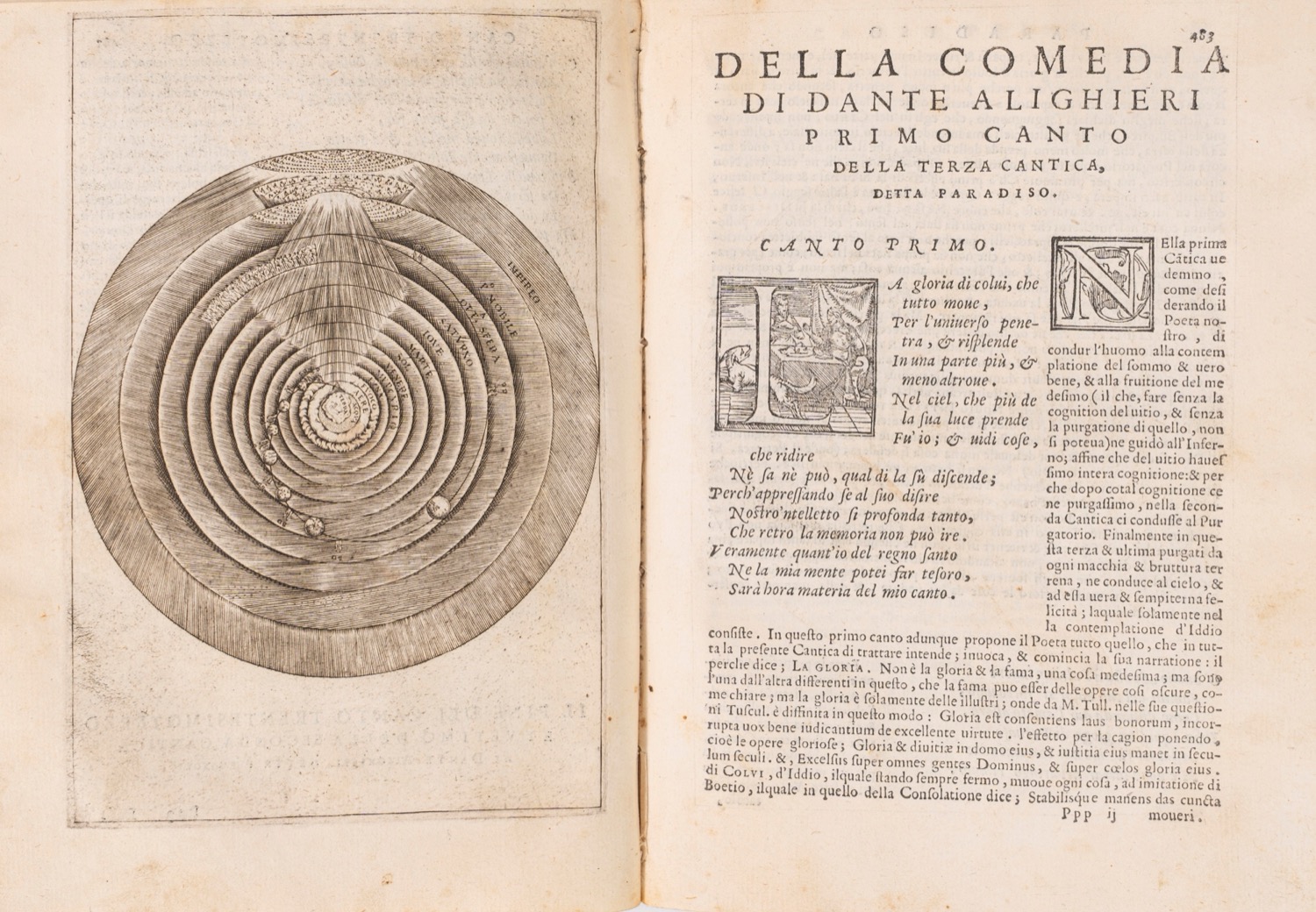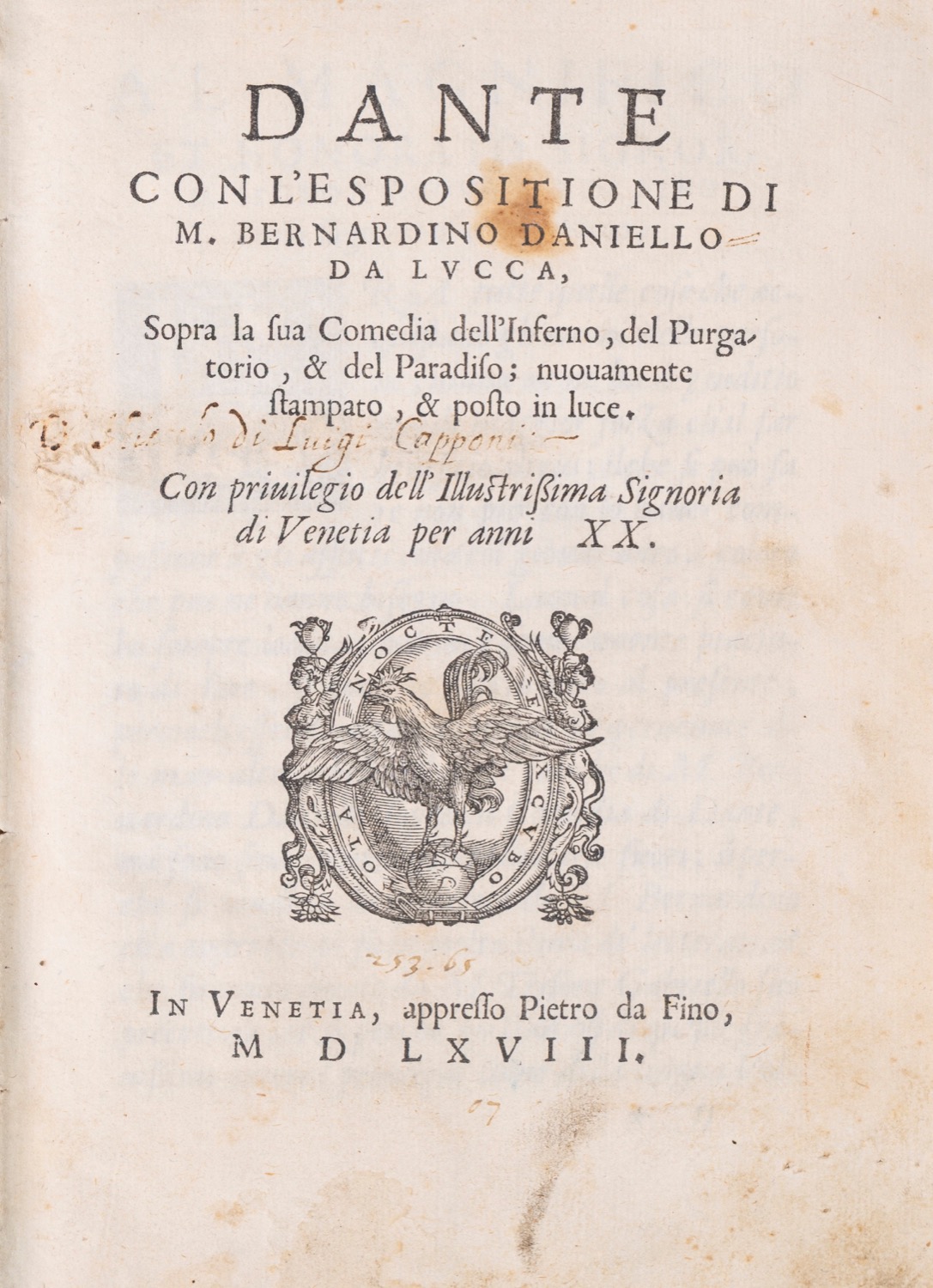 PRIMA ED UNICA EDIZIONE della Commedia con commento di Bernardino Daniello. Data alle stampe postuma nel 1568 dal poco conosciuto editore veneziano Pietro di Fino. Batines definì questa edizione come assaissima e molto ricercata proprio grazie al commento di Daniello. Questa edizione ebbe però una limitata diffusione a causa delle accuse di plagio che gravarono sulla stessa. Daniello infatti, per quest'opera così come per un'altra, la Poetica, venne accusato di aver attinto da scritti di Gabriel Trifone, suo maestro durante gli anni padovani. De Batines I, pp. 93-94; Mambelli, 41; STC Italian 210; Adams D, 104.