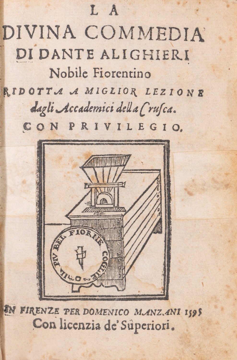 Firenze, per Domenico Manzani, 1595. In 8°. Legatura in mezza pergamena con angoli. Dorso liscio con decori in oro e tassello recante titolo e autore. Tagli a spruzzo. Ex libris eraso al contropiatto. Marca tipografica al frontespizio. Iniziali xilografiche con gli emblemi degli Accademici e fregi xilografici. Tavola ripiegata raffigurante la pianta dell'Inferno. Le pp. 262-263 erroneamente numerate 266-267; le pp. 266-267 erroneamente numerate 262-263; le pp. 510-511 erroneamente numerate 496 e 493. Segni di inchiostro nero, postille marginali e arrossature. Firenze, per Domenico Manzani, 1595. In 8°. Legatura in mezza pergamena con angoli. Dorso liscio con decori in oro e tassello recante titolo e autore. Tagli a spruzzo. Ex libris eraso al contropiatto. Marca tipografica al frontespizio. Iniziali xilografiche con gli emblemi degli Accademici e fregi xilografici. Tavola ripiegata raffigurante la pianta dell'Inferno. Le pp. 262-263 erroneamente numerate 266-267; le pp. 266-267 erroneamente numerate 262-263; le pp. 510-511 erroneamente numerate 496 e 493. Segni di inchiostro nero, postille marginali e arrossature.