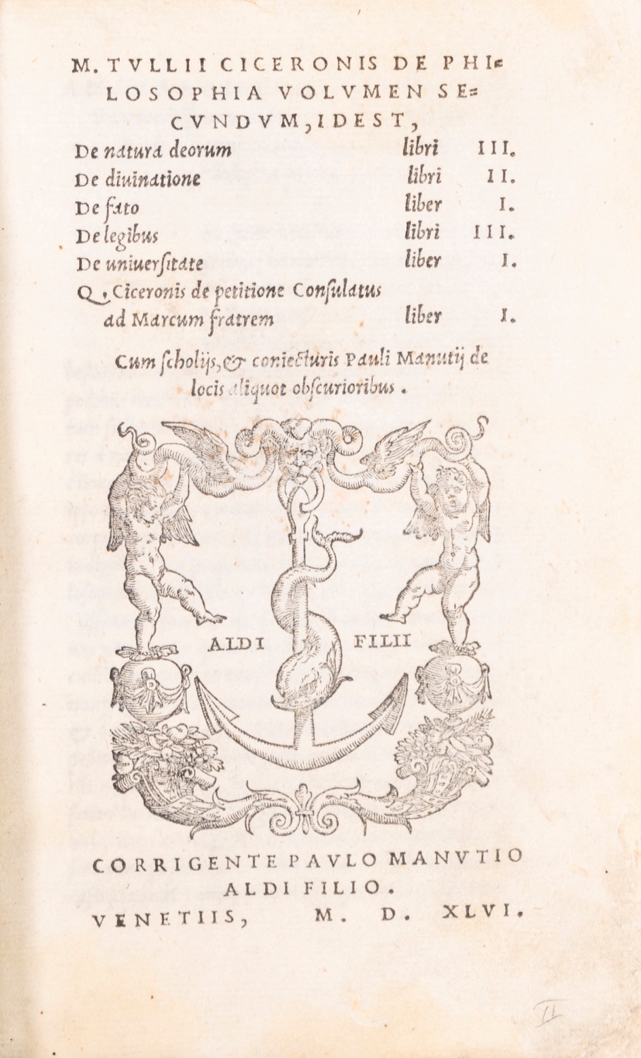 De philosophia pars prima (et secunda), id est. Corrigendi Paulo Manutio Aldus Filii, MDXLVI. Al colophon: Apud Aldi filios, MDXLVI. 8°, voll. 2, prima pars: 4 cc. nn.; 147 cc. num.; 9 cc. nn. Segue da carta 148 a carta 251 il "Tusculanarum quaestiones.." con proprio frontespizio + 7 cc. nn. (compreso il foglio bianco e il foglio con l'ancora aldina). Secunda pars: 3 cc. nn.; 213 cc. num.; 16 cc. nn. compreso il foglio con il colophon e il foglio con l'ancora aldina). Marca tipografica ai frontespizi e al colophon. Legatura moderna in stile monastico, in piena pergamena molle, titolo calligrafico ai dorsi. Cfr. Renouard, pag. 136, n° 8 – 10. De philosophia pars prima (et secunda), id est. Corrigendi Paulo Manutio Aldus Filii, MDXLVI. Al colophon: Apud Aldi filios, MDXLVI. 8°, voll. 2, prima pars: 4 cc. nn.; 147 cc. num.; 9 cc. nn. Segue da carta 148 a carta 251 il "Tusculanarum quaestiones.." con proprio frontespizio + 7 cc. nn. (compreso il foglio bianco e il foglio con l'ancora aldina). Secunda pars: 3 cc. nn.; 213 cc. num.; 16 cc. nn. compreso il foglio con il colophon e il foglio con l'ancora aldina). Marca tipografica ai frontespizi e al colophon. Legatura moderna in stile monastico, in piena pergamena molle, titolo calligrafico ai dorsi. Cfr. Renouard, pag. 136, n° 8 – 10.