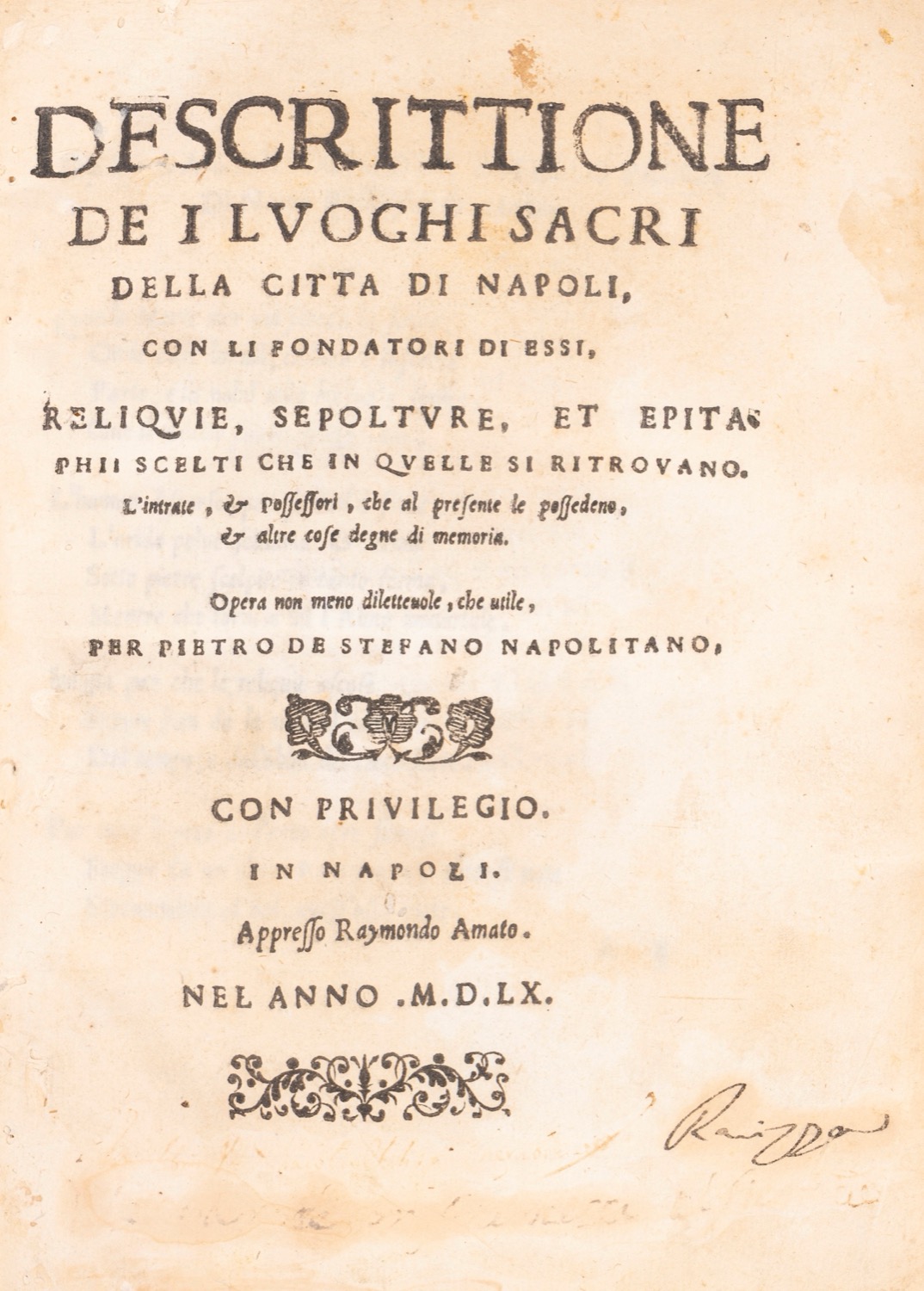 Descrittione de i Luoghi Sacri della città di Napoli, con li fondatori di essi. Reliquie, sepolture, et epitaphii scelti che in quelle si ritrovano, Napoli, Raymondo Amato, 1560. 4°, Legatura coeva in piena pergamena, titolo calligrafico.