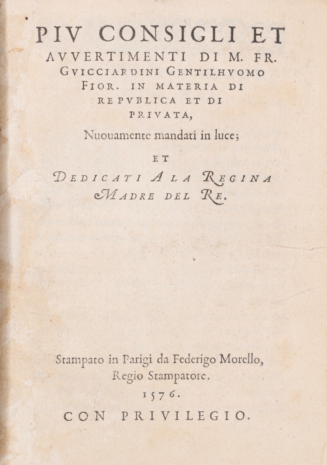 Guicciardini, Francesco - Più consigli et avvertimenti di M. Fr. Guicciardini...in materia di Republica et di Privata [Ricordi], 1576