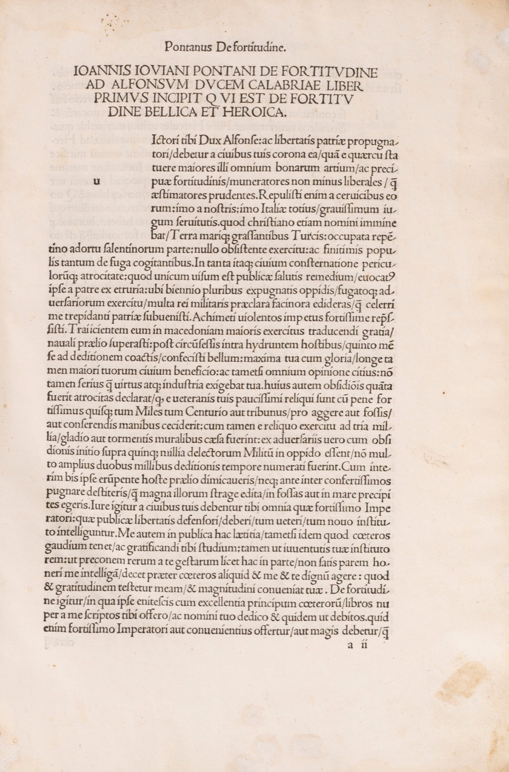 Venezia, Bernardino Viani, 1501. In 2°. Spazi per capilettera, titoli delle opere alla prima carta, nota di possesso Dni Petri Quattrocchi, e un’altra conventuale a seguire, legatura in pergamena floscia del sec. XVII. Nota di possesso coeva manoscritta alla prima carta. RARA PRIMA EDIZIONE delle prose del Pontano, qui riunite in un unico volume. Fu riconosciuto, già dal Sannazaro, come uno dei più fecondi letterati del Quattrocento e forse il maestro assoluto dell'Umanesimo napoletano, abbracciando nella sua opera numerosi aspetti della vita culturale (non soltanto letteraria) della sua epoca: dall'astrologia, all'etica, all'analisi della società, alla retorica, alla botanica. La presente raccolta include: De Fortitudine, De Principe, Dialogus Antonius inscribitur, De Liberitate, De Beneficentia, De Magnificentia, De Splendore, De Conviventia, De Obedentia. Manca il Dialogus qui Charon inscribitur, solitamente censurato.Venezia, Bernardino Viani, 1501. In 2°. Spazi per capilettera, titoli delle opere alla prima carta, nota di possesso Dni Petri Quattrocchi, e un’altra conventuale a seguire, legatura in pergamena floscia del sec. XVII. Nota di possesso coeva manoscritta alla prima carta. RARA PRIMA EDIZIONE delle prose del Pontano, qui riunite in un unico volume. Fu riconosciuto, già dal Sannazaro, come uno dei più fecondi letterati del Quattrocento e forse il maestro assoluto dell'Umanesimo napoletano, abbracciando nella sua opera numerosi aspetti della vita culturale (non soltanto letteraria) della sua epoca: dall'astrologia, all'etica, all'analisi della società, alla retorica, alla botanica. La presente raccolta include: De Fortitudine, De Principe, Dialogus Antonius inscribitur, De Liberitate, De Beneficentia, De Magnificentia, De Splendore, De Conviventia, De Obedentia. Manca il Dialogus qui Charon inscribitur, solitamente censurato.