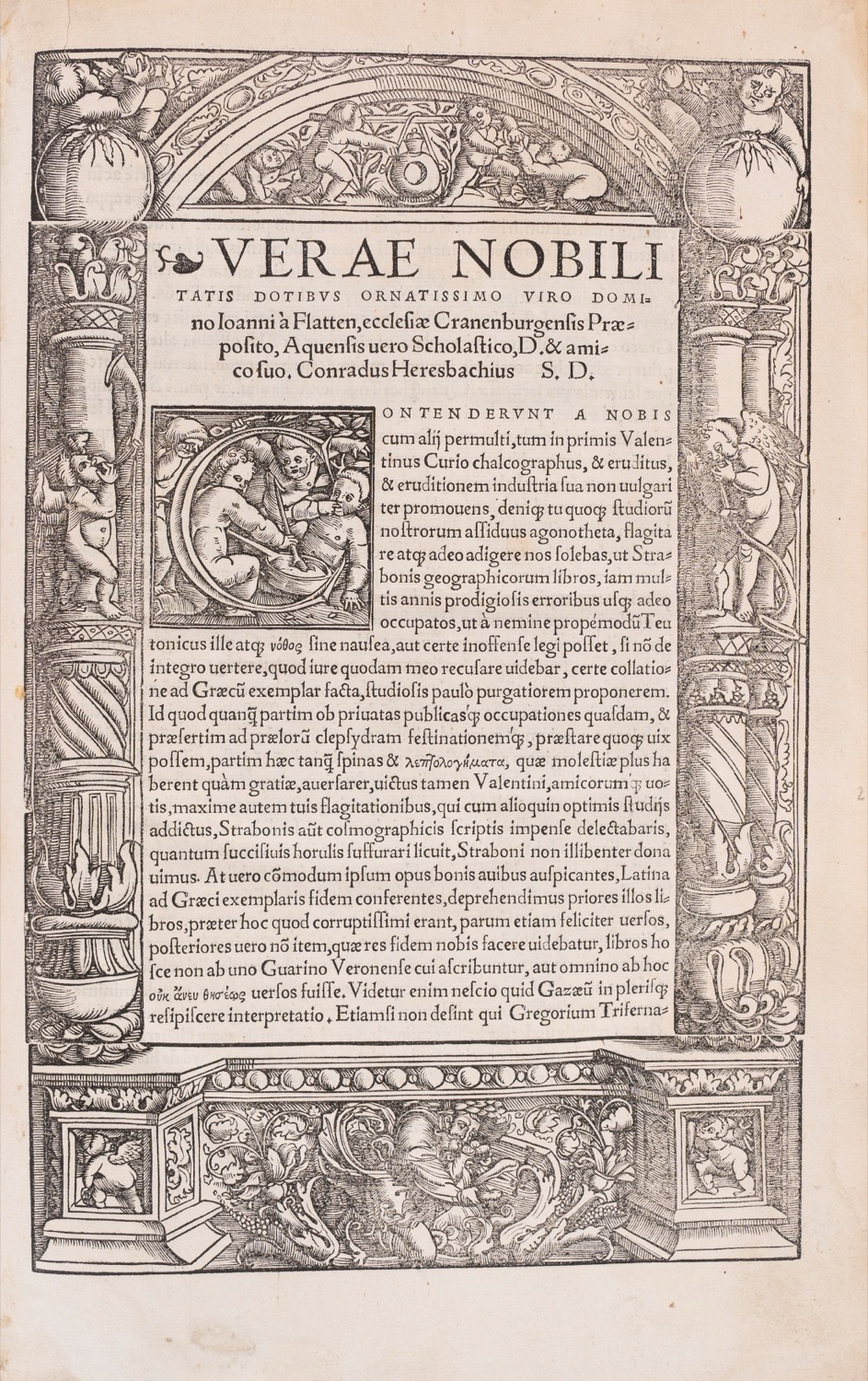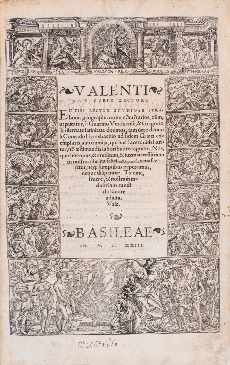 Prima edizione del Cinquecento e primo saggio d'una edizione critica di Strabone (cfr. Graesse VI, 506).Basilea, Curion, 1523. In folio. Legatura antica in vitello su asticelle. Dorso con 4 nervi. Piatti con decorazione a freddo. Belle bordure incise in legno sia nel frontespizio che nella seconda carta. Capolettera, fregi e testatine. Marca tipografica al fine. Leggere bruniture, segni di penna e dorso della legatura rifatto.