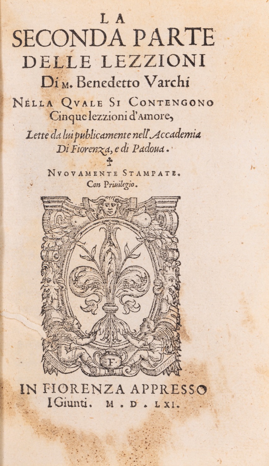 Firenze, appresso i Giunti, 1561. In 8°. Legatura in mezza pelle. Dorso con 2 tasselli. Secondo volume di 2. Marca tipografica al frontespizio. A c. *2r. dedica di Silvano Razzi a Iacopo Salviati e a c. A1r. dedica di Benedetto Varchi a Giulio della Stufa. Leggere bruniture e arrossature.Firenze, appresso i Giunti, 1561. In 8°. Legatura in mezza pelle. Dorso con 2 tasselli. Secondo volume di 2. Marca tipografica al frontespizio. A c. *2r. dedica di Silvano Razzi a Iacopo Salviati e a c. A1r. dedica di Benedetto Varchi a Giulio della Stufa. Leggere bruniture e arrossature.