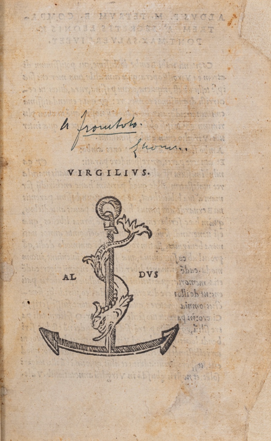 Ottima edizione aldina del Virgilio nell'edizione successiva al 1517: le due pagine di errata, presenti nell'edizione del 1514, sono sostituite da due carte bianche, ed è assente la lettera "t" al registro, seppur il fascicolo t risulta presente. RENOUARD (68, 8) facendo riferimento a questa edizione, nota: «extremement Correcte, et méritant à tous égards l'estime qui lo portoit Nic. Heinsius» (che utilizzò l'edizione corretta per una ristampa in piccolo formato nel 1676) e pone la pubblicazione di questa versione emendata non prima del 1519. MAMBELLI , Virgilio 124: «la seconda [la presente], invece, fu eseguita con ogni cura e meritò le lodi del Heinsio e del Heyne. Questa, in luogo dell'Errata, ha le 4 pagine bianche».