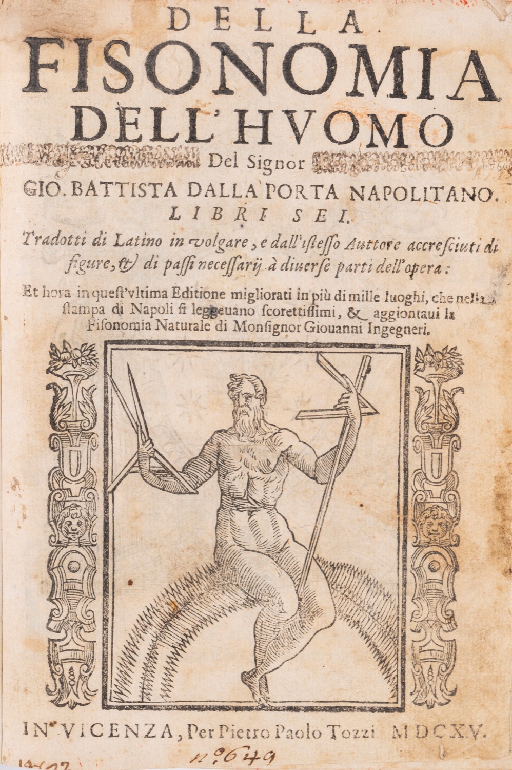 Comprende anche Fisionomia naturale di monsignor Giovanni Ingegneri con frontespizio proprio.Vicenza, per Pietro Paolo Tozzi, 1615. In 4°. Legatura in piena pergamena con tassello recante autore e titolo al dorso. Tagli a spruzzo in rosso. Vignetta xilografica al frontespizio. Stemma xilografico del dedicatario, Paolo Frassinelli, sul verso della c. a1. Ritratti xilografici alle cc. a3v e b4v. Dedica datata al 1613. Il volume è corredato di diverse xilografie interne al testo. Leggere bruniture, restauri, segni di inchiostro. Alcune pagine sono leggermente rifilate. Omesse nella numerazione le cc. 151-152.