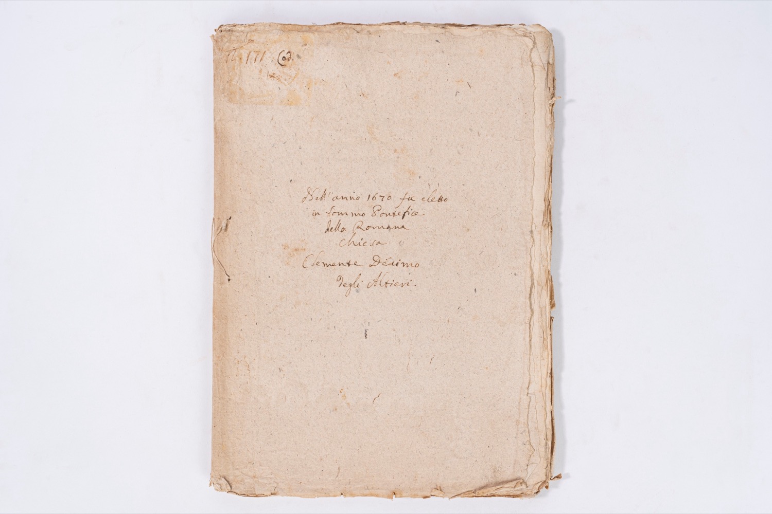Manoscritto cartaceo di 105 pagine non numerate, più 3 bianche, 315 x 225 mm., seconda metà del XVII sec., coperta originale in cartoncino. Elegante cancelleresca del sec.XVII con 19 righe per pagina. Si legge sulla coperta esteriore la seguente nota: "Nell'anno 1670 fu eletto in Sommo Pontefice della Romana Chiesa Clemente Decimo degli Altieri".Manoscritto cartaceo di 105 pagine non numerate, più 3 bianche, 315 x 225 mm., seconda metà del XVII sec., coperta originale in cartoncino. Elegante cancelleresca del sec.XVII con 19 righe per pagina. Si legge sulla coperta esteriore la seguente nota: "Nell'anno 1670 fu eletto in Sommo Pontefice della Romana Chiesa Clemente Decimo degli Altieri".
