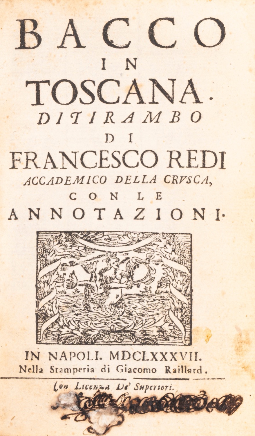 Napoli, Raillard, 1687. In 16°. Marca tipografica al frontespizio. Legatura coeva in piena pergamena (restaurata), titolo calligrafico. Seconda edizione dopo quella fiorentina del 1685 di questo famoso poema che dopo le prime 46 pagine, nelle annotazioni descrive le virtù del vino e dunque i benefici di un bere moderato, ricordando e illustrando oltre i vini toscani anche moltissimi vini italiani.