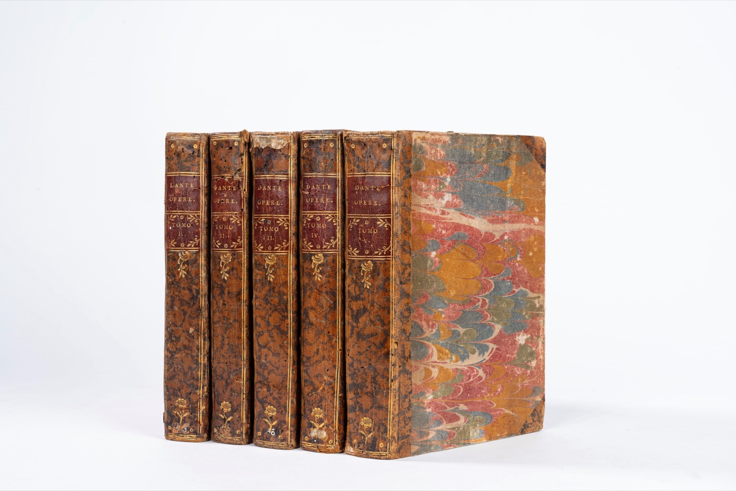 Prose, e rime liriche di Dante Alighieri.Venezia, Antonio Zatta, 1760. In 8°. Legatura in mezza pelle con angoli. Piatti marmorizzati. Dorso liscio con tasselli recanti autore, titolo e numeri dei tomi. Tagli in blu. Frontespizi con vignette. Ritratto di Dante entro medaglione nel primo volume. Piccoli difetti alla legatura e al dorso. Leggere bruniture. Opera in 3 volumi.