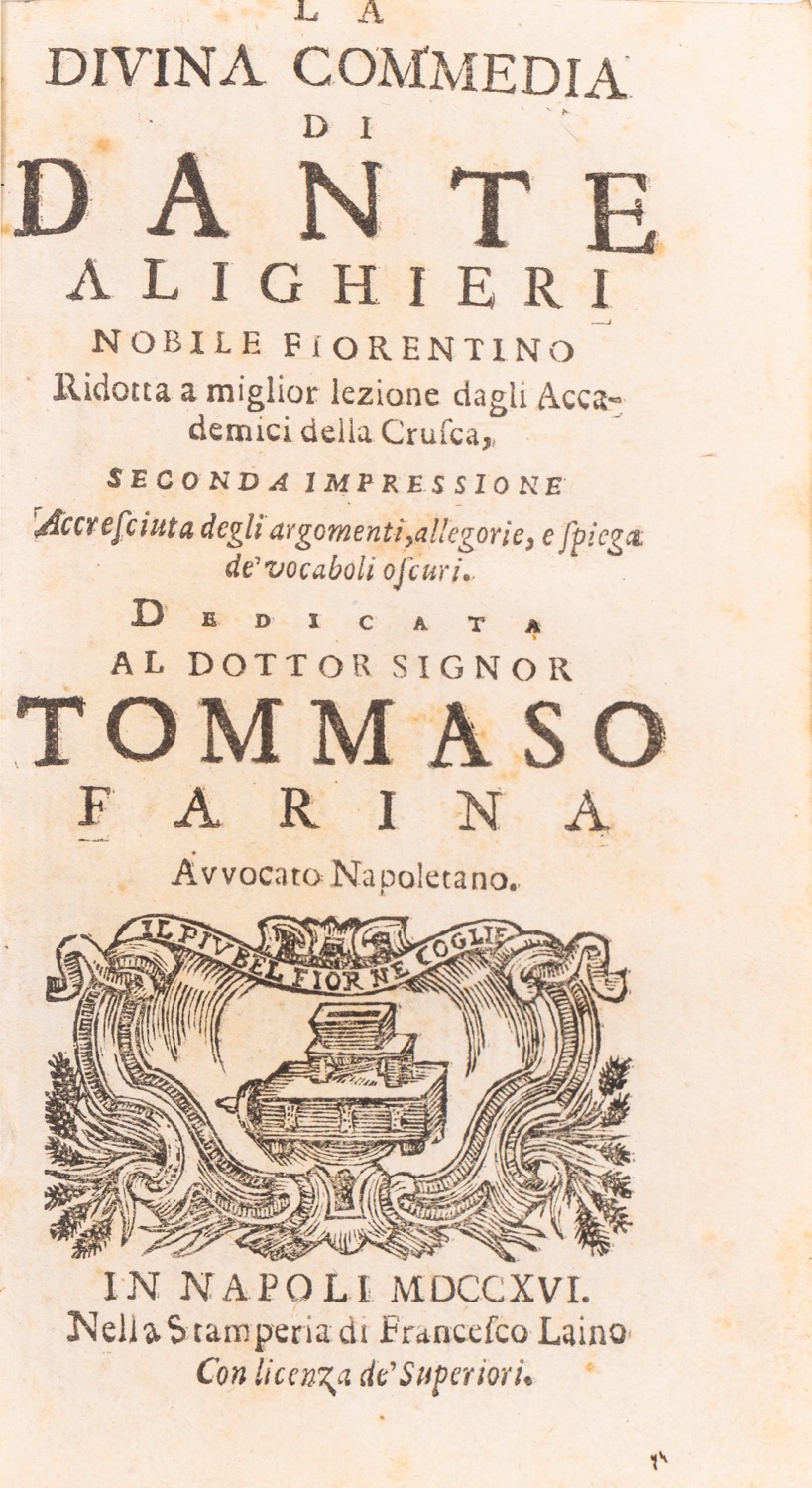 Napoli, Francesco Laino, 1716. In 8°. Legatura in mezza pelle. Dorso liscio con autore, titolo e decori in oro. Piatti in tela con decori a motivo floreale. Dedica a Tommaso Farina, avvocato napoletano. Emblema dell'Accademia della Crusca al frontespizio, iniziali xilografiche. Alcune pagine sono leggermente rifilate. Lievi arrossature e bruniture. Segni di matita. Piccoli difetti alla legatura. Timbro al contropiatto. Napoli, Francesco Laino, 1716. In 8°. Legatura in mezza pelle. Dorso liscio con autore, titolo e decori in oro. Piatti in tela con decori a motivo floreale. Dedica a Tommaso Farina, avvocato napoletano. Emblema dell'Accademia della Crusca al frontespizio, iniziali xilografiche. Alcune pagine sono leggermente rifilate. Lievi arrossature e bruniture. Segni di matita. Piccoli difetti alla legatura. Timbro al contropiatto.