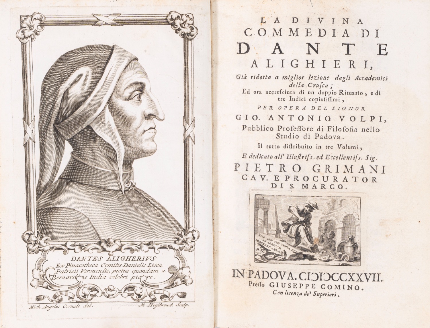 Padova, Giuseppe Comino, 1727. In 8°. Legatura in piena pergamena. Dorso liscio con tassello. Tagli a spruzzo in blu. Opera in 3 volumi. Ritratto di Dante inciso a bulino da Michael Heylbroeck su disegno di Michelangelo Cornale nel primo volume. Marca tipografica ai frontespizi. Stemma al fine di ogni volume. Ex libris ai contropiatti dei 3 volumi. Segni di inchiostro. Esemplare in ottimo stato di conservazione. Padova, Giuseppe Comino, 1727. In 8°. Legatura in piena pergamena. Dorso liscio con tassello. Tagli a spruzzo in blu. Opera in 3 volumi. Ritratto di Dante inciso a bulino da Michael Heylbroeck su disegno di Michelangelo Cornale nel primo volume. Marca tipografica ai frontespizi. Stemma al fine di ogni volume. Ex libris ai contropiatti dei 3 volumi. Segni di inchiostro. Esemplare in ottimo stato di conservazione.