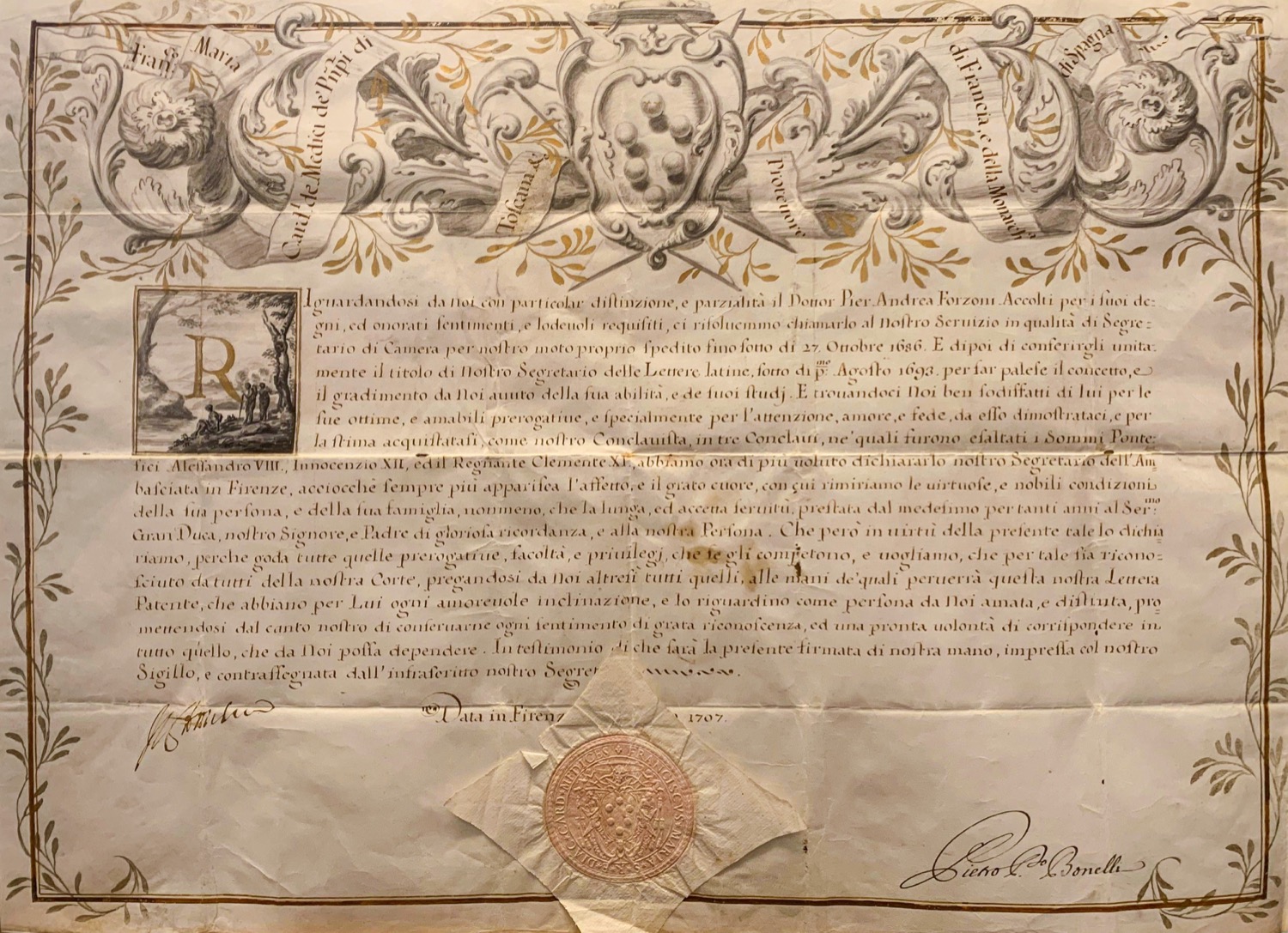 Splendida Lettera Patente su pergamena datata Firenze 1707 e sottoscritta da Pietro Bonelli a favore di Pier Andrea Forzoni Accolti, dove si ribadisce l'incarico di Segretario di Camera, di Segretario delle Lettere Latine e di Segretario dell'Ambasciata di Firenze. Eleganti fregi fitomorfi e stemma mediceo in alto, iniziale R finemente decorata con scena arcadica. Splendida Lettera Patente su pergamena datata Firenze 1707 e sottoscritta da Pietro Bonelli a favore di Pier Andrea Forzoni Accolti, dove si ribadisce l'incarico di Segretario di Camera, di Segretario delle Lettere Latine e di Segretario dell'Ambasciata di Firenze. Eleganti fregi fitomorfi e stemma mediceo in alto, iniziale R finemente decorata con scena arcadica.