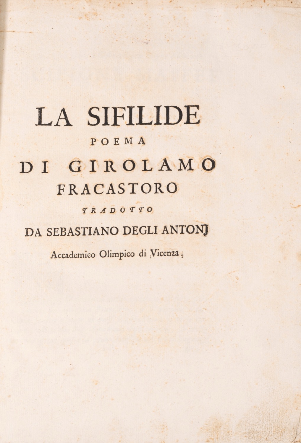 Esemplare della traduzione settecentesca del poema eroicomico a cura di Sebastiano degli Antoni, pubblicato per la prima volta ad Augusta nel 1530, dal Fracastoro, fisico e filosofo, proveniente da famiglia patrizia veronese. Gamba 2244.Bologna, a S. Tommaso d'Acquino, 1738. In 4°. Legatura in mezza pelle. Dorso con 5 nervi e con titolo, autore e decori in oro. Lievi bruniture. Alcune pagine sono leggermente rifilate.
