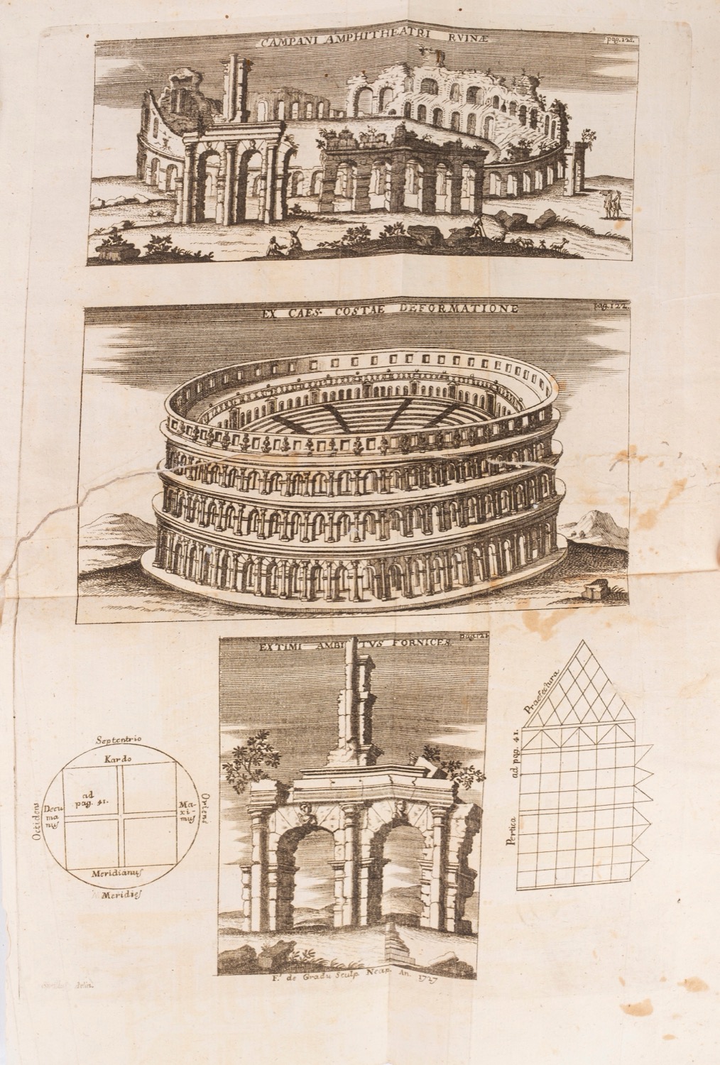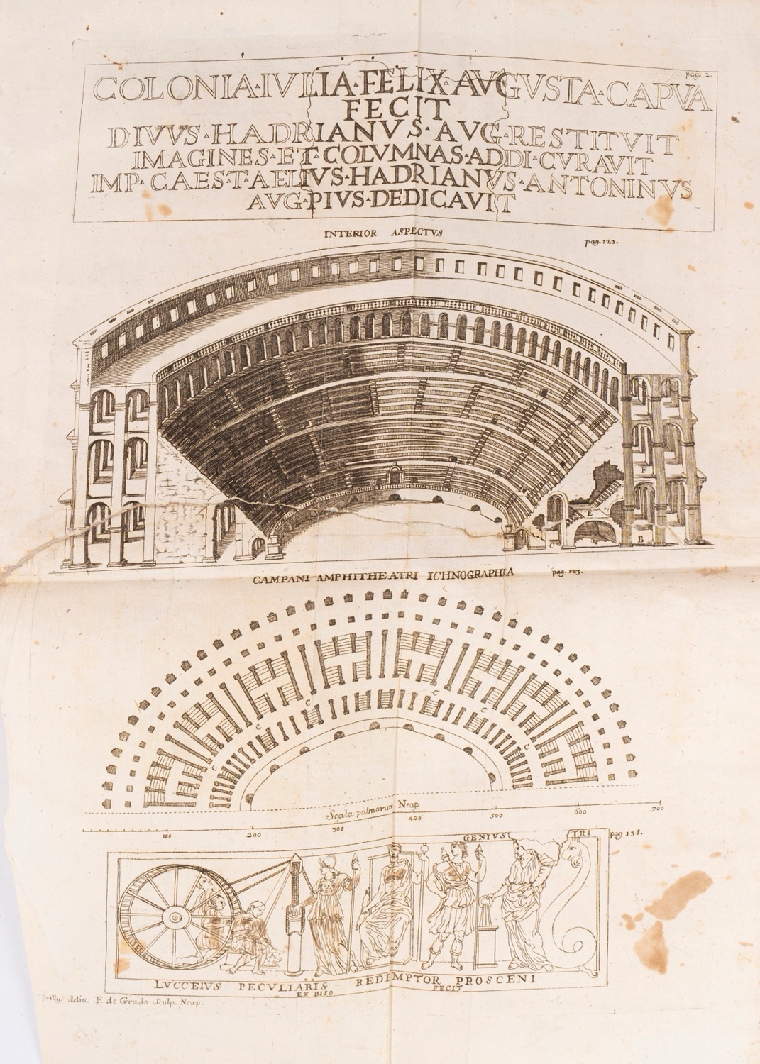 In mutilum Campani Amphiteatri titulum. Aliasque nonnullas Campanas Inscriptiones. Neapolis ex Regio Typographo Vincentii Ursini, 1797. 4°, con due grandi tavole incise su rame e più volte ripiegate f.t. raffiguranti antiche iscrizioni e vedute esterne ed interne dell'anfiteatro. Legatura coeva in piena pergamena. In mutilum Campani Amphiteatri titulum. Aliasque nonnullas Campanas Inscriptiones. Neapolis ex Regio Typographo Vincentii Ursini, 1797. 4°, con due grandi tavole incise su rame e più volte ripiegate f.t. raffiguranti antiche iscrizioni e vedute esterne ed interne dell'anfiteatro. Legatura coeva in piena pergamena.