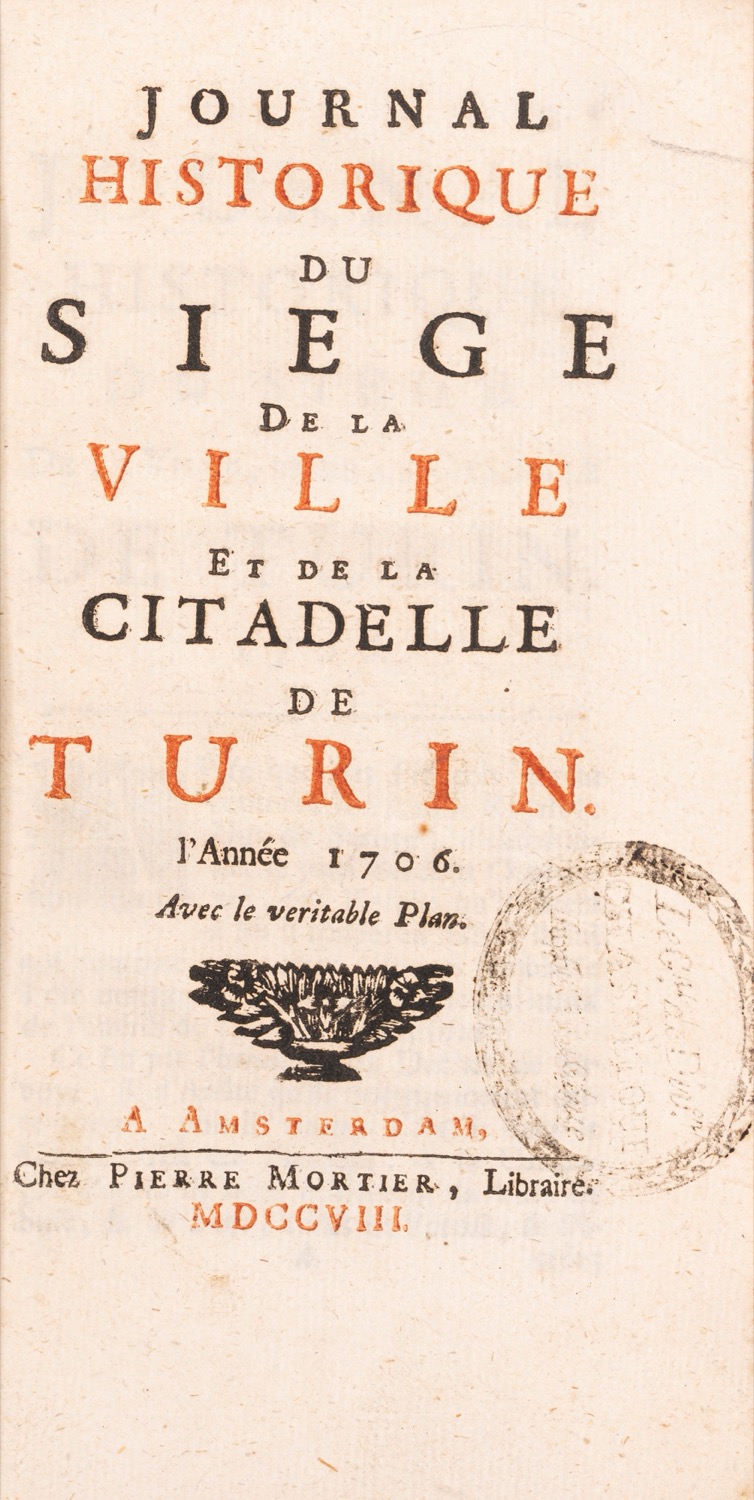 Journal Historique du siege de la Ville et de la Cittadelle de Turin l'Année 1706, Amsterdam, Pierre Mortier, 1708. In 12°. Legatura in piena pelle. Dorso con 5 nervi e con titolo e fregi in oro. Tagli a spruzzo. Sguardie marmorizzate. Frontespizio in rosso e nero. Timbro al frontespizio. Testo in francese. Al fine è presente l'opera Journal du siege de Bouchain. Piccoli difetti alla legatura.