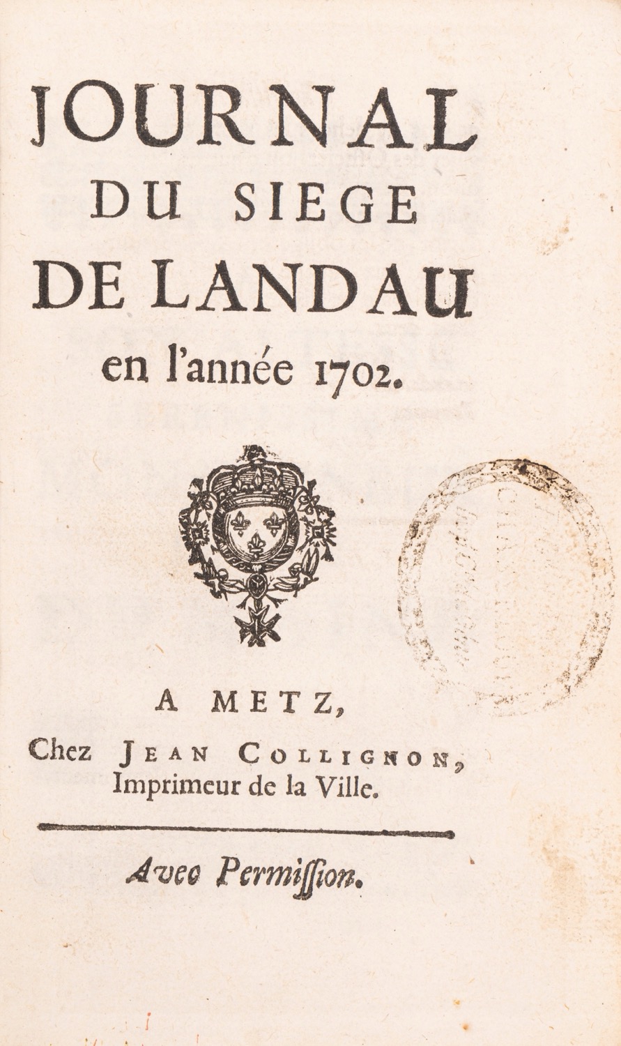 Relation du siege de grave en 1674, et de celui de Mayence en 1689, Parigi, chez C.A. Jombert, 1746. In 12°. Legatura in piena pelle. Dorso con 5 nervi e con titolo e fregi in oro. Tagli in rosso. Sguardie marmorizzate. Testo in francese. Carta geografica della città di Magonza. Piccoli difetti alla legatura.Journal Historique du siege de la Ville et de la Cittadelle de Turin l'Année 1706, Amsterdam, Pierre Mortier, 1708. In 12°. Legatura in piena pelle. Dorso con 5 nervi e con titolo e fregi in oro. Tagli a spruzzo. Sguardie marmorizzate. Frontespizio in rosso e nero. Timbro al frontespizio. Testo in francese. Al fine è presente l'opera Journal du siege de Bouchain. Piccoli difetti alla legatura.
